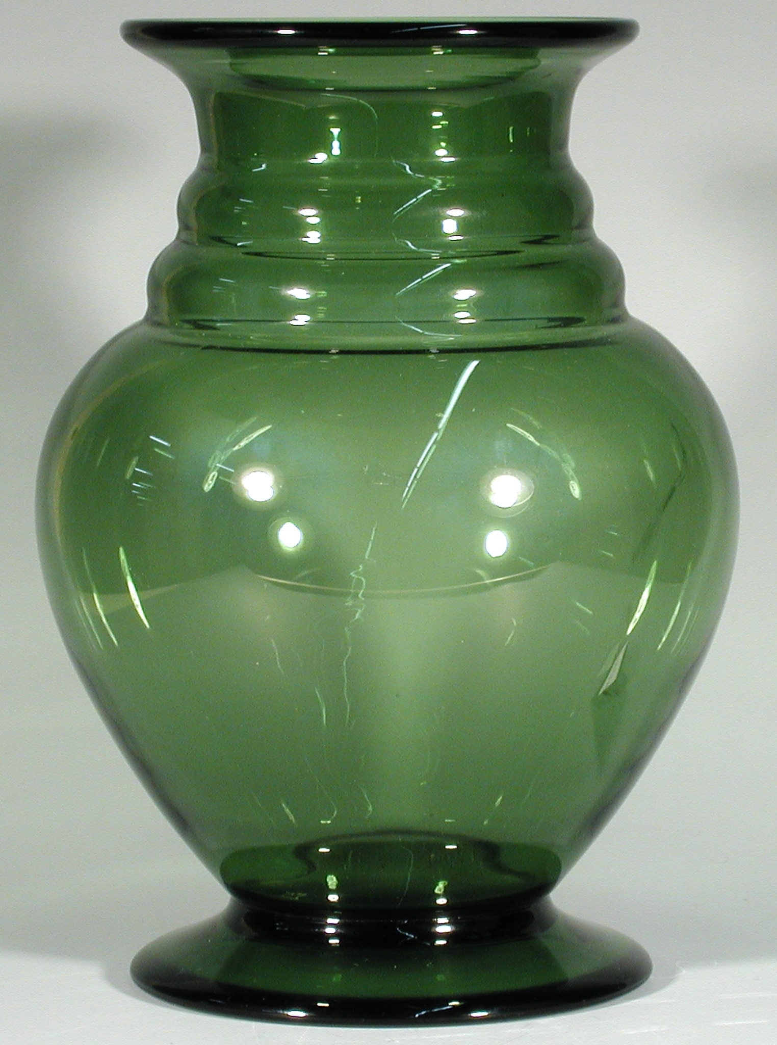 Verre vert soufflé en moule, col large à deux renflements, pied appliqué, revêtement émaillé noir posé à l'aérographe; forme: panse ovoïde