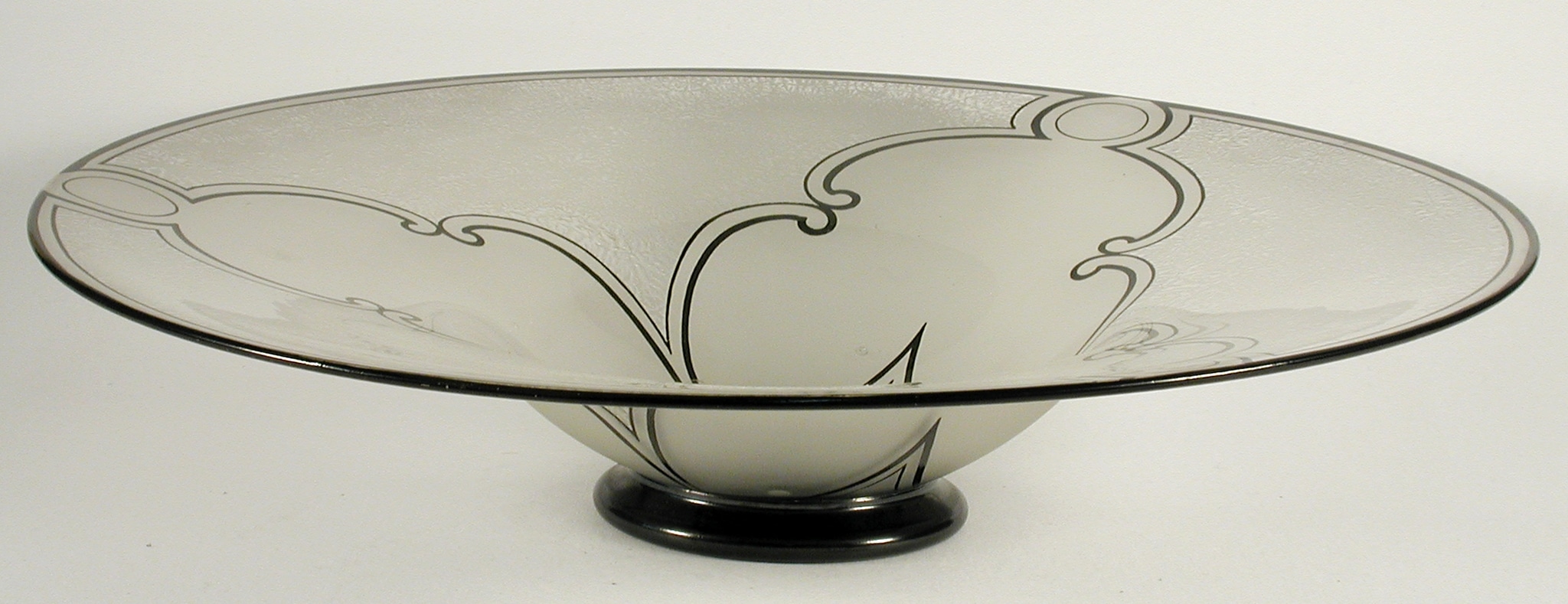 La coupe présentée ici a été décorée à l'aide de plusieurs techniques à froid: des champs sablés et givrés à l'acide appliqués en alternance ainsi que des motifs géométriques émaillés noirs. À Saint-Prex, c’est Frantisek Landgraf, décorateur verrier d'origine slovène qui disposait de ces connaissances.