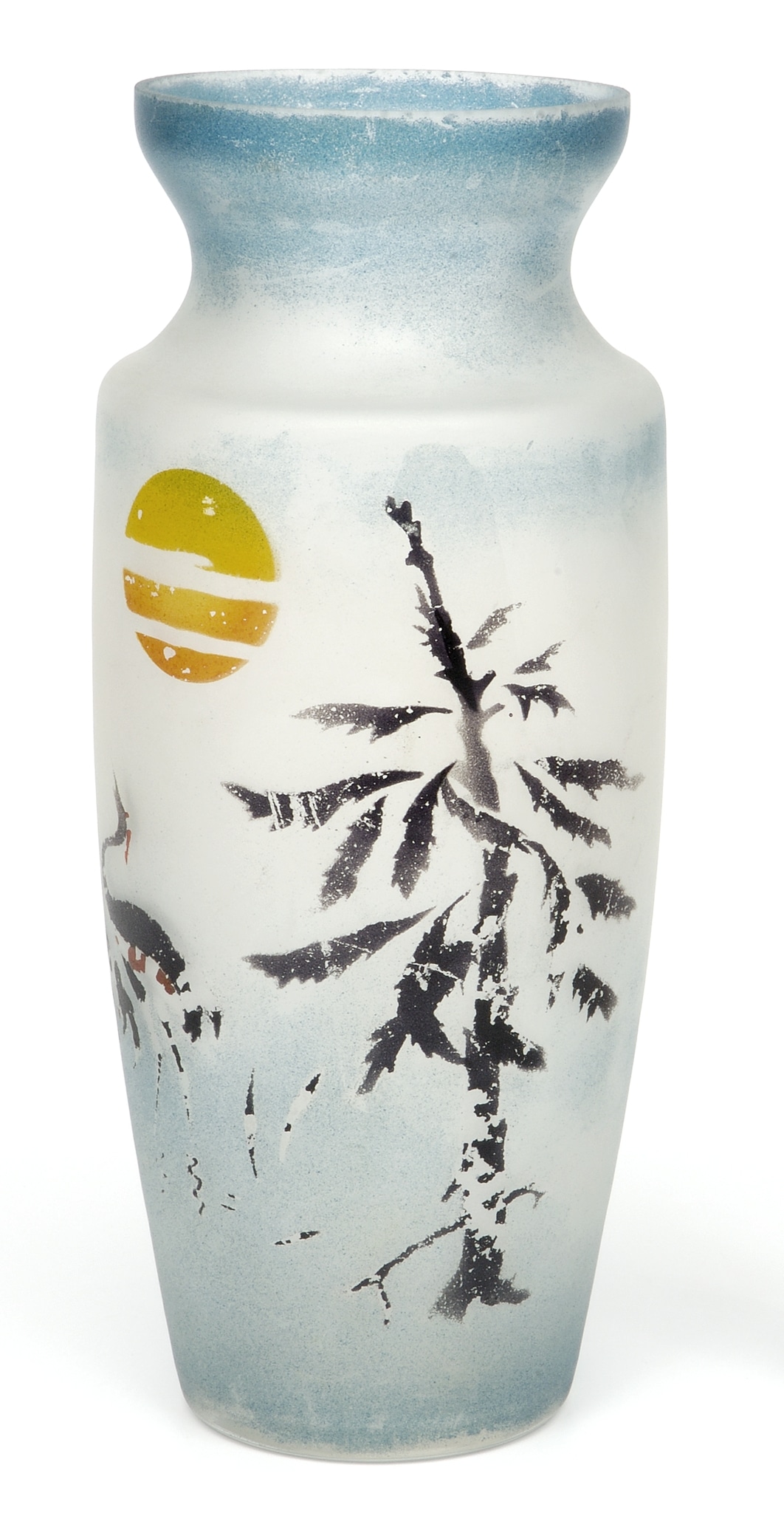 Inspiré des vases Art nouveau avant tout français (Cappa, 2001, 367‑368), on retrouve les sujets de l'École de Nancy, mais sans les techniques sophistiquées qui lui sont propres. Soufflés en verre incolore, ils sont sablés puis peints à froid à l'aide de pochoirs, tandis que les fonds sont traités à l'aérographe. Les aquarelles qui ont servi de modèles – à motifs végétaux, récréatifs ou proposant des vues de pays lointains – proviennent des archives du Musée du verrier (Verreries de St-Prex, Modèles de Vases, 1930). Certains critiques ont mal interprété cette technique, suggérant qu’il s’agissait d’une peinture blanche appliquée sur le vase: "Die an der Mustermesse gezeigten, mit einer milchigen Masse überschmierten, vielfach mit Segelschiffen und andern Naivitäten bemalten (…) Stücke (…)", ([s.n.], 1933). À une époque où l’art concret était de mise, ces vases d’inspiration Art nouveau sortaient du lot. Par ailleurs, cette technique appartient au domaine de la céramique, où la polychromie était recuite et donc stable; pour le verre et sans cuisson, elle est plutôt inhabituelle.