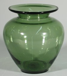 Verre turquoise soufflé en moule, revêtement émaillé noir et rouge posé à l'aérographe; forme: panse tronconique