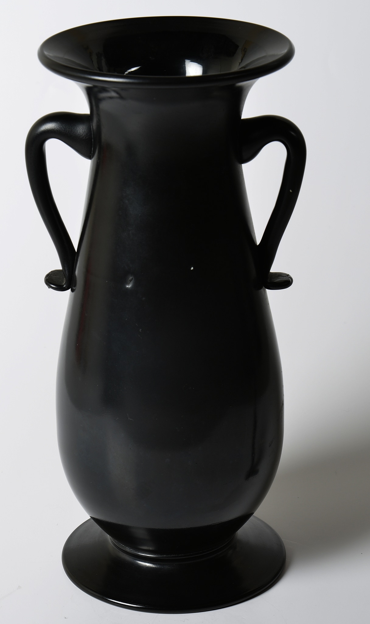 Verre vert, soufflé en moule, pied et anses (à retour) appliquées, lèvre évasée, revêtement émaillé noir posé à l'aérographe; forme: balustre