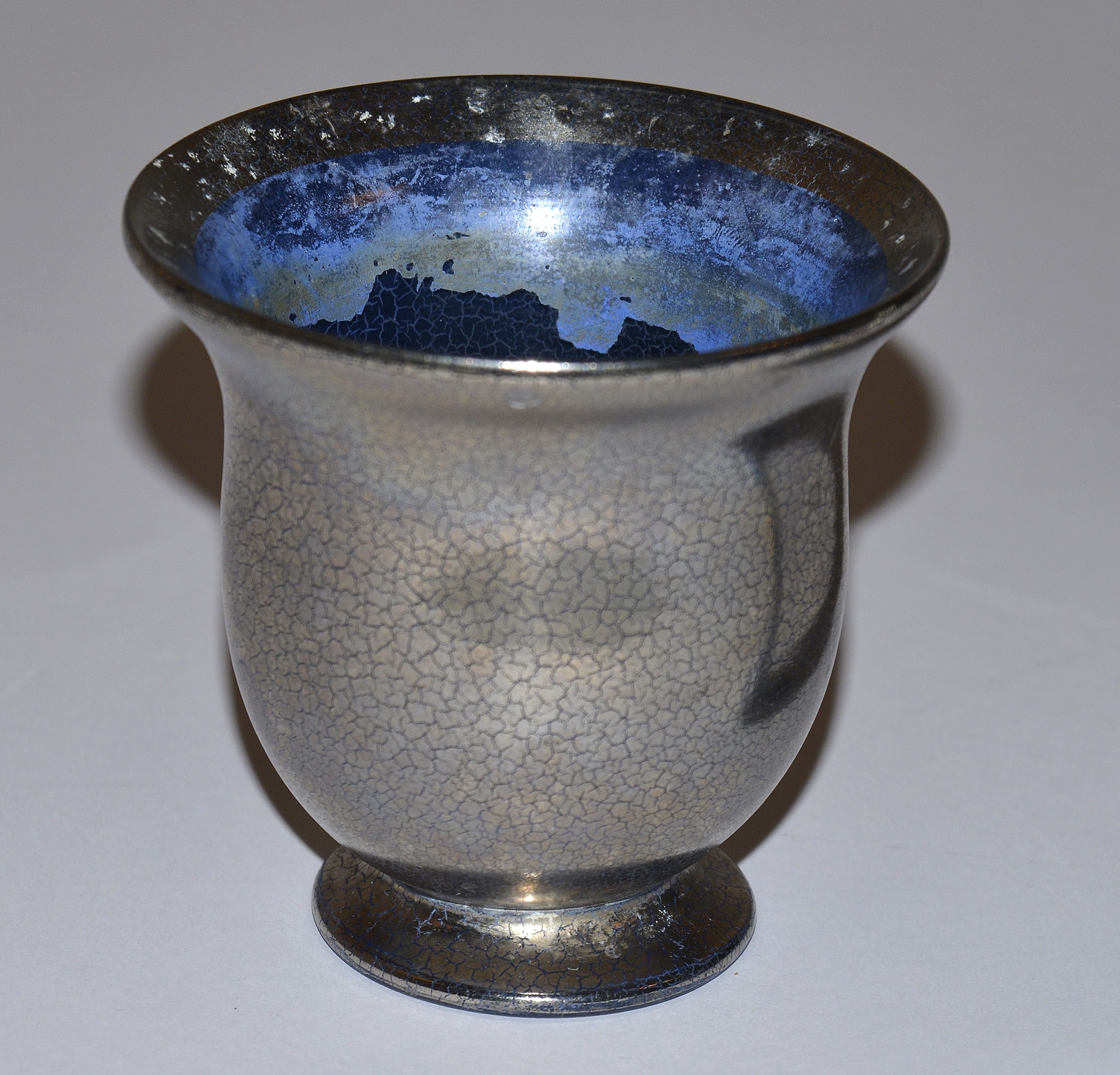 Verre incolore soufflé en moule, lèvre évasée, pied appliqué à chaud, revêtement d'émail bleu appliqué à l'aérographe, recouvert d'argent qui se craquelle durant la recuisson; forme: panse balustre