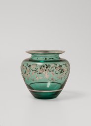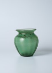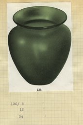 Ce modèle de vase (136) fut créé à une période précoce de la Verrerie artistique (1930-1964). Les sources dont nous disposons sont des catalogues de la Verrerie de St-Prex, certains inédits, tels que les albums noirs munis de photographies de vases, vraisemblablement utilisés par les représentants de 1931 à 1935, où ce modèle porte le no 1. Il est disponible en verre vert, avec un décor géométrique noir et or, ou antique gravé à l'acide (deux types), à pied – uni ou marbré (Verreries de St-Prex, 1931, H 8.5, 11 et 19 cm). Ce modèle fait également partie de l’offre du premier catalogue de vente imprimé de 1935 (Verreries de St-Prex, 1935, 8 et 12), où il est décliné en verre vert et en bordé or. Il figure ensuite dans un répertoire non publié, qui, basé sur les numéros d’inventaire des catalogues de 1935 à 1960, dresse la liste de tous les modèles de la production artistique (Verreries de St-Prex, 1964, H 8, 12 et 24 cm.). Dès 1951, le modèle de 24 cm n’est plus produit (Verreries de St-Prex, 1951). D’après les sources, il a ainsi été élaboré dès 1930 et produit jusqu’en 1964.