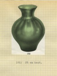 Ce modèle de vase (152) fut créé à une période précoce de la Verrerie artistique (1930-1964). Les sources dont nous disposons sont des catalogues de la Verrerie de St-Prex, certains inédits, tels que les albums noirs munis de photographies de vases, vraisemblablement utilisés par les représentants de 1931 à 1935, où ce modèle est disponible en verre vert et porte le no 152 (Verreries de St-Prex, 1931, H 25 cm). Il fait également partie de l’offre du premier catalogue de vente imprimé en 1935 (Verreries de St-Prex, 1935, 5). Il figure ensuite dans un répertoire non publié, qui, basé sur les numéros d’inventaire des catalogues de 1935 à 1960, dresse la liste de tous les modèles de la production artistique (Verreries de St-Prex, 1964, H 25 cm). Il n’apparaît plus dans le catalogue de 1951 (Verreries de St-Prex, 1951). D’après les sources, ce modèle a ainsi été élaboré dès 1931 et produit jusqu’en 1951 environ.