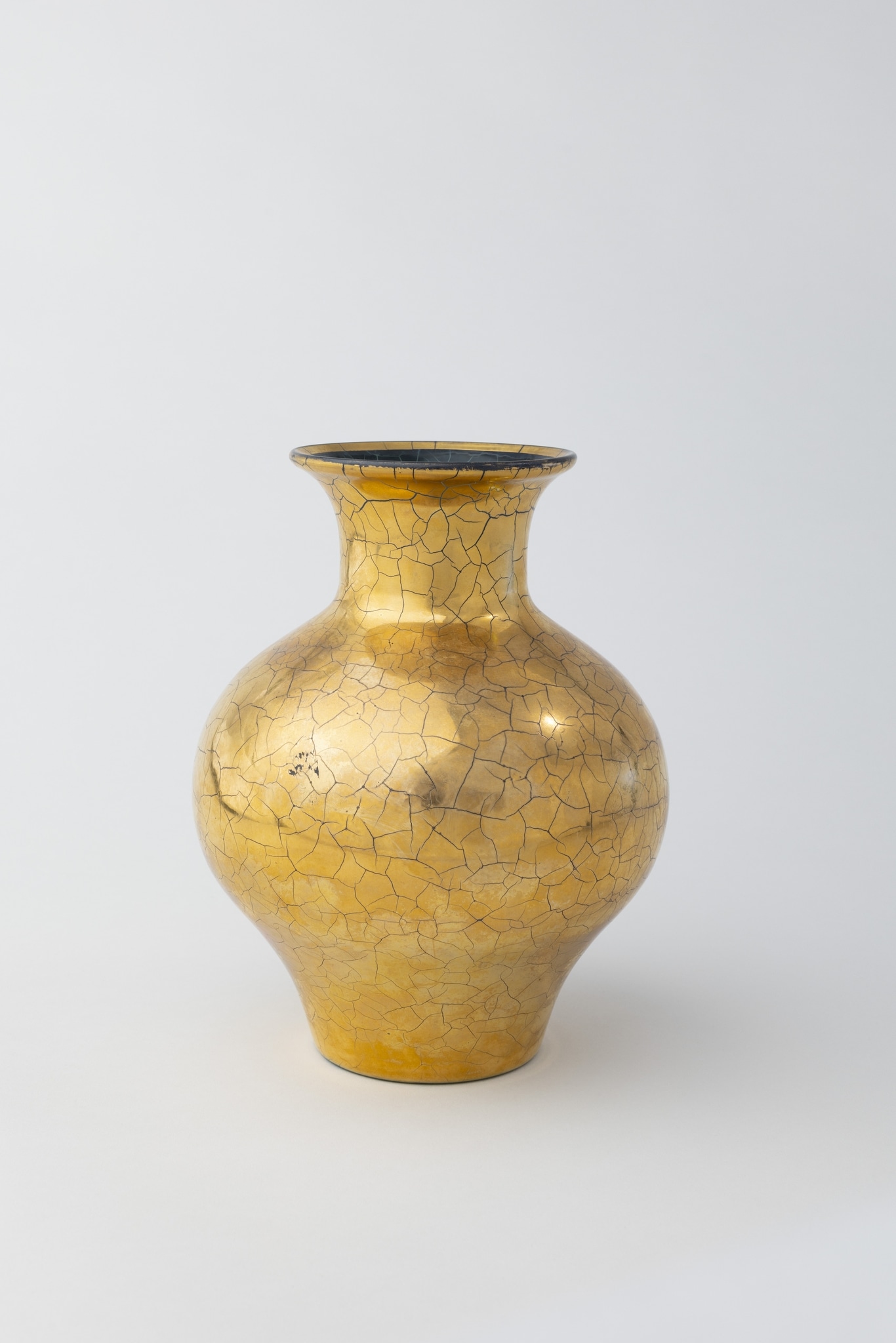 Le décor doré craquelé du vase présenté ici est emblématique de la Verrerie artistique, son apparition coïncidant avec la publication du catalogue de 1935. Serré et peu brillant, il est typique d'une pièce réalisée avec l'émail bleu disponible jusqu’en 1942 (Walther, 2025, 65). Notre vase a donc été réalisé entre 1935 et 1951.