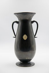 Ce modèle de vase (147) fut créé à une période précoce de la Verrerie artistique (1930-1964). Il s’agit du même modèle que le 146, avec l’adjonction d’anses. Les sources dont nous disposons sont des catalogues de la Verrerie de St-Prex, certains inédits, tels que les albums noirs munis de photographies de vases, vraisemblablement utilisés par les représentants de 1931 à 1935, où ce modèle est proposé comme no "spécial vert" : H 35, 50 cm, (Verreries de St-Prex, 1931). Il fait également partie de l’offre du premier catalogue de vente imprimé en 1935 (Verreries de St-Prex, 1935, no 147, 2 et 14) où ce vase est décliné en verre vert et en argent craquelé. Un exemple du Musée du Verrier présente un pied trilobé. Il figure ensuite dans un répertoire non publié, qui, basé sur les numéros d’inventaire des catalogues de 1935 à 1960, dresse la liste de tous les modèles de la production artistique (Verreries de St-Prex, 1964, H 22, 27, 32 et 43 cm). Dès 1951, le grand format (43 cm) n’est plus produit (Verreries de St-Prex, 1951). D’après les sources, ce modèle a été ainsi élaboré dès 1931 et produit jusqu’en 1964.