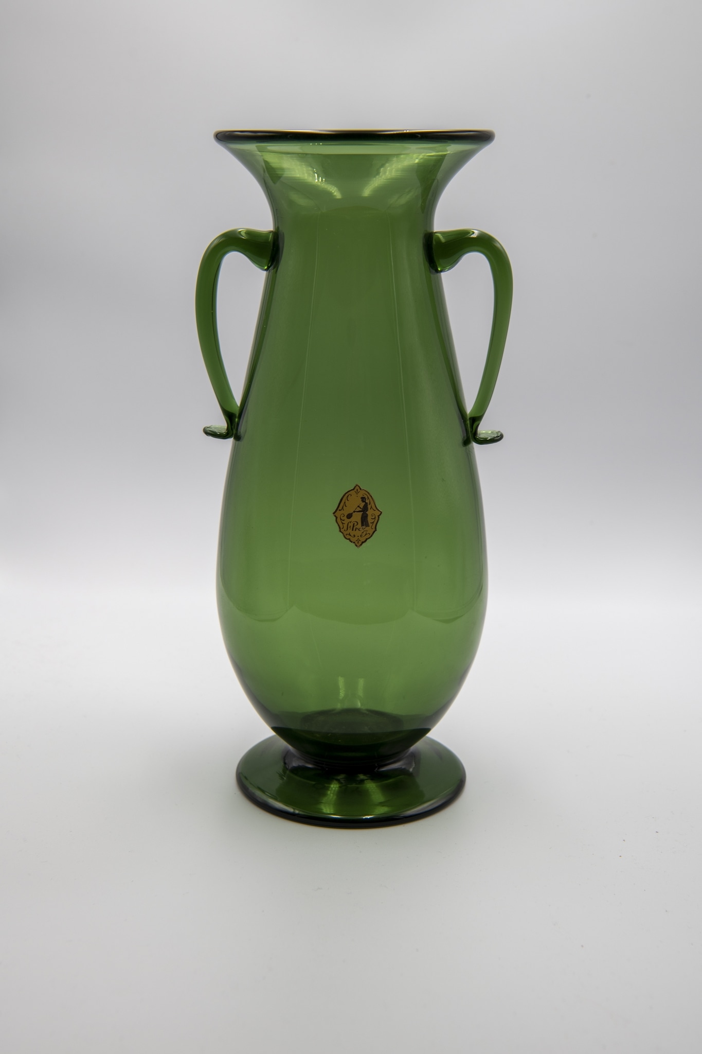 Sans le timbre doré des premières années ou d’autres particularités, rien ne suggère que le vase présenté ici a été produit avant 1935. Lorsque les pièces en verre vert ne présentaient ni impuretés ni défauts de fabrication, elles étaient commercialisées telles quelles. Sinon, elles servaient de base à la réalisation de vases émaillés.