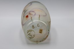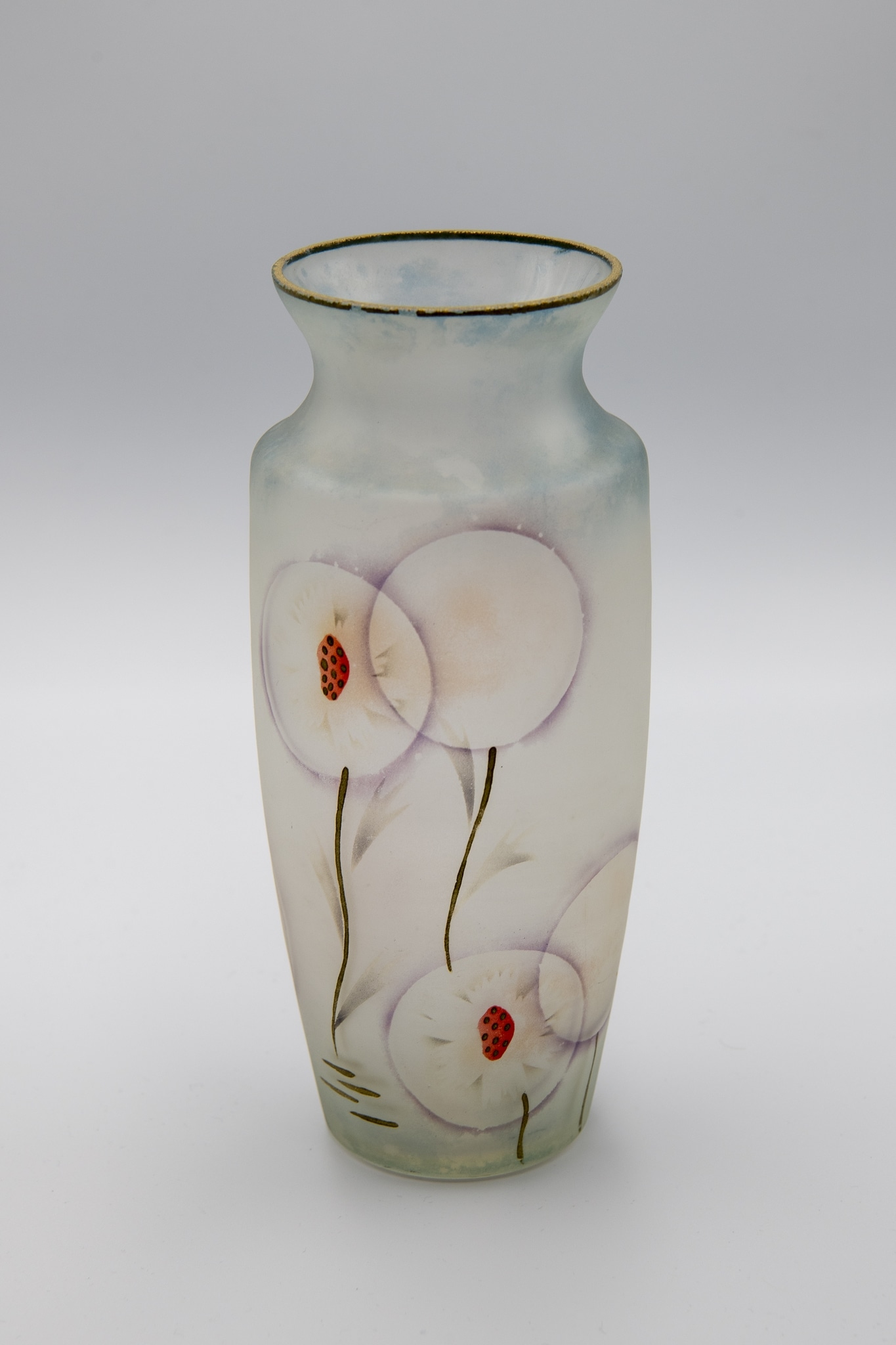 Vase en verre incolore sablé, fond bleu clair sur le col et le bas. Décor d’œillets stylisés sous forme de cercles aux contours violets posés à l'aérographe, ainsi que les feuilles en lancettes de couleur brun foncé. les tiges et le sol sont relevés de lignes dorées, tracées au pinceau. Deux capitules sont peints en rouge et noir.