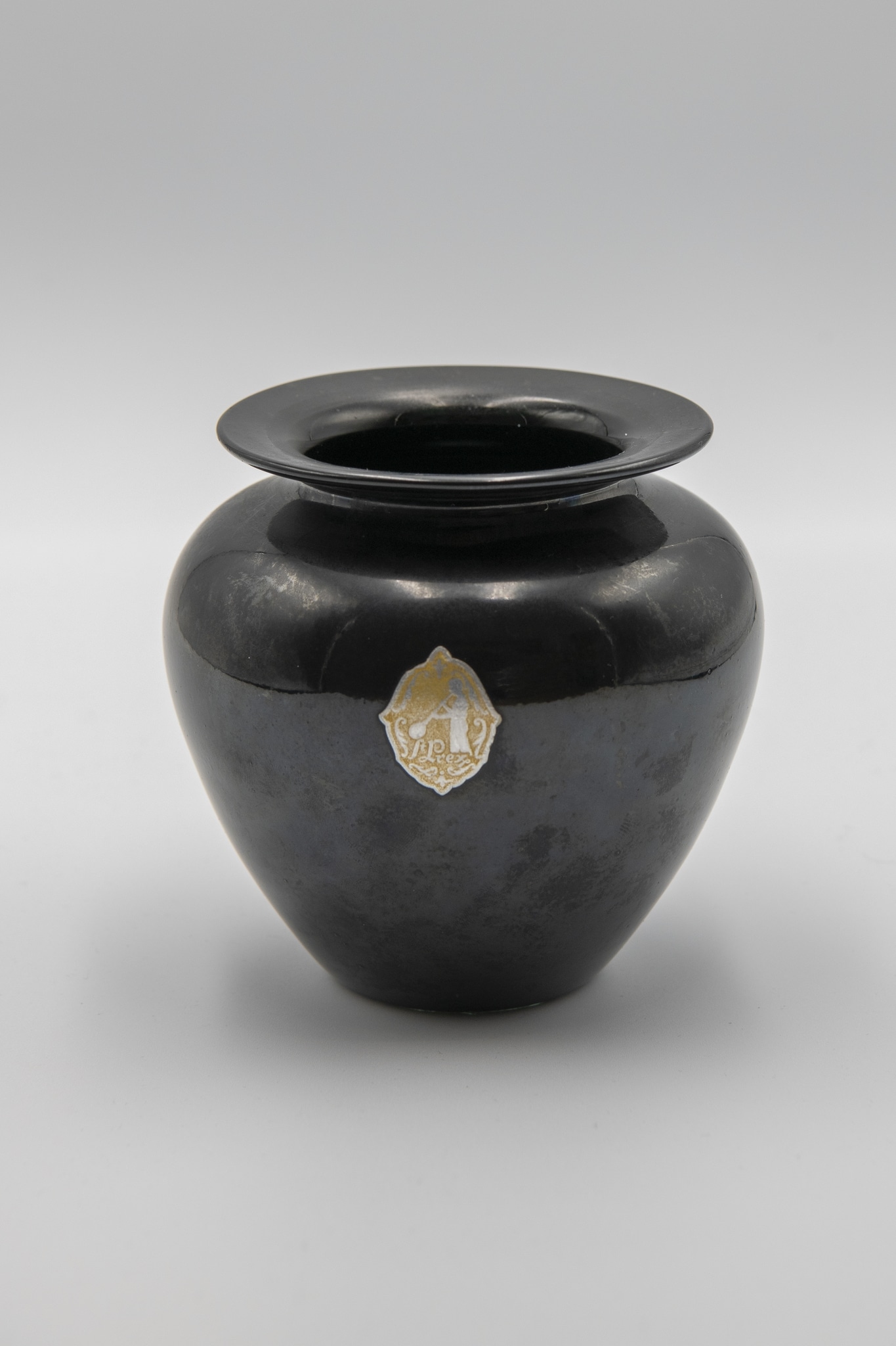 La coloration turquoise du vase présenté ici semble être liée aux restrictions durant la Seconde Guerre mondiale. Cette dernière ainsi que l'étiquette munie du souffleur suggèrent une production postérieure à 1935. Ce vase évoque également les fameuses terres lustrées noires du céramiste Paul Ami Bonifas.
