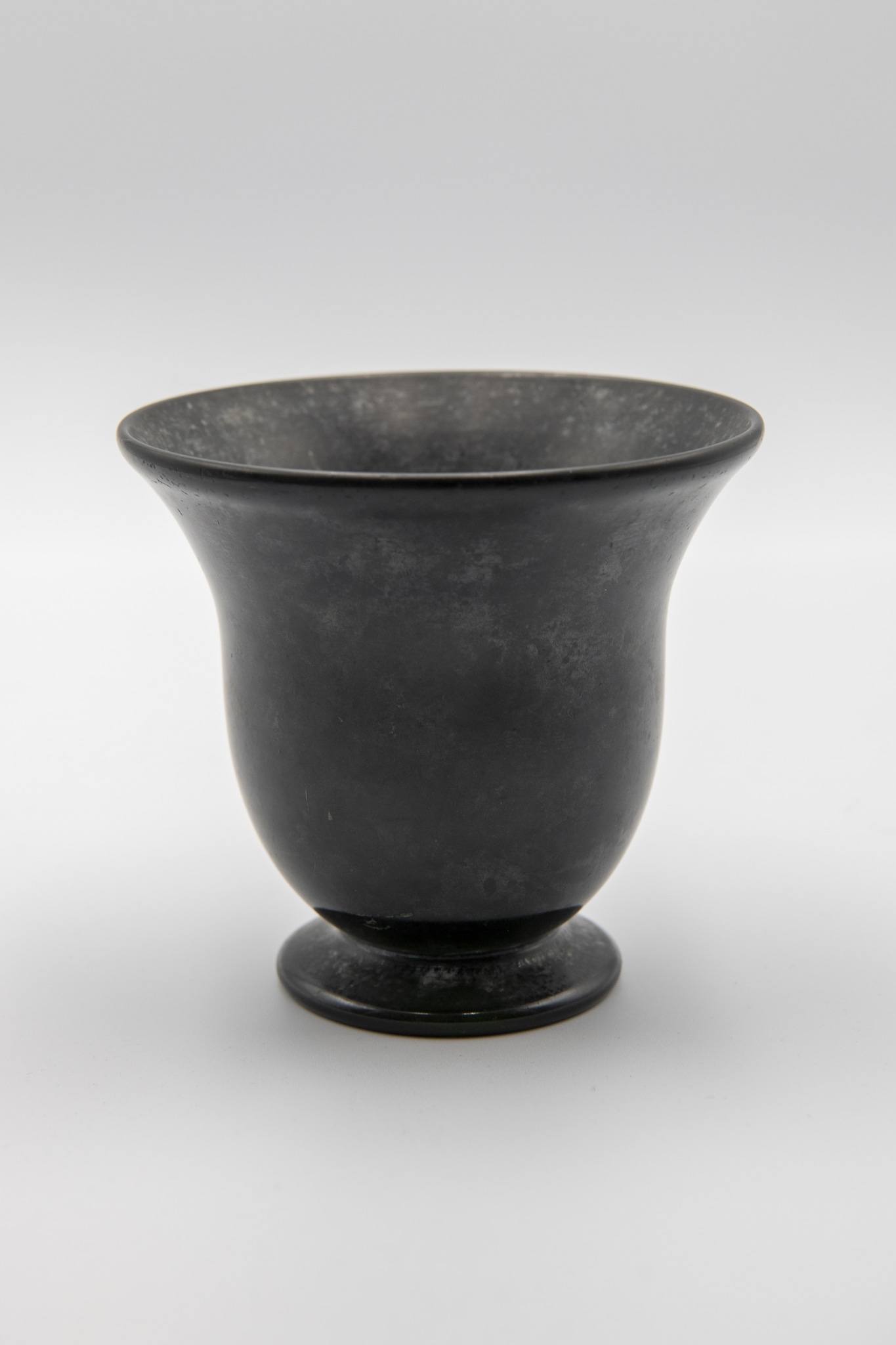 Verre vert soufflé en moule, travaillé à la pince, pied appliqué, revêtement émaillé noir posé à l'aérographe; forme: panse balustre sur pied, lèvre évasée