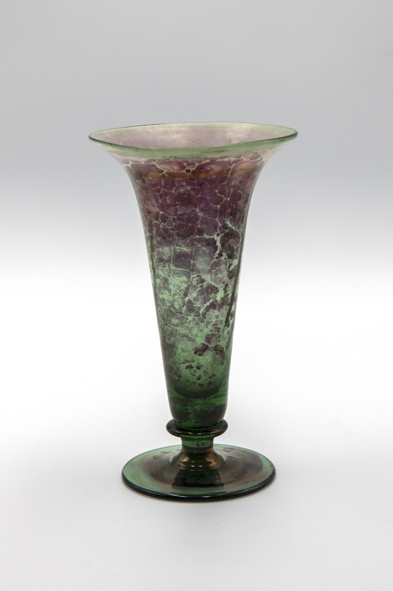 Verre vert, soufflé à main levée, oxydes à coloration rose-rouge, lèvre évasée, piédouche appliqué, surface irisée; forme: calice