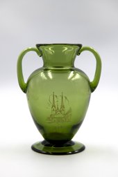 Verre vert soufflé en moule, anses et pied appliqués, col étroit, légèrement évasé; forme: panse ovoïde