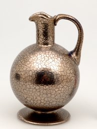 Verre vert soufflé en moule, col droit, bec verseur, pied et anse appliqués; revêtement émaillé bleu puis doré, les craquelures irrégulières apparaissant lors de la cuisson qui fixe le décor; forme: panse sphérique