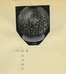 Ce modèle (176) fut créé à une période précoce de la Verrerie artistique (1930-1964). Les sources dont nous disposons sont des catalogues de la Verrerie de St-Prex, certains inédits, tels que les albums noirs munis de photographies de vases, vraisemblablement utilisés par les représentants de 1931 à 1935. Le modèle converti en pied de lampe porte le no 8 (D 18 ou 20 cm) ou 9/164 (D 15, 18, 20 ou 22 cm) (Verreries de St-Prex, 1931). Le no 176 est le dernier no d’inventaire du catalogue de vente imprimé en 1935 (Verreries de St-Prex, 1935, 1), mais il correspond mal à cette production semi-industrielle qui ne prévoit pas d’exceptions. Il figure ensuite dans un répertoire non publié, qui, basé sur les numéros d’inventaire des catalogues de 1935 à 1960, dresse la liste de tous les modèles de la production artistique (Verreries de St-Prex, 1964, D 10, 12, 14, 16 et 22 cm). La liste de prix de 1951 ne le propose plus (Verreries de St-Prex, 1951). D’après les sources, ce modèle a ainsi été élaboré dès 1931 et produit jusqu’en 1935 environ.