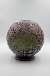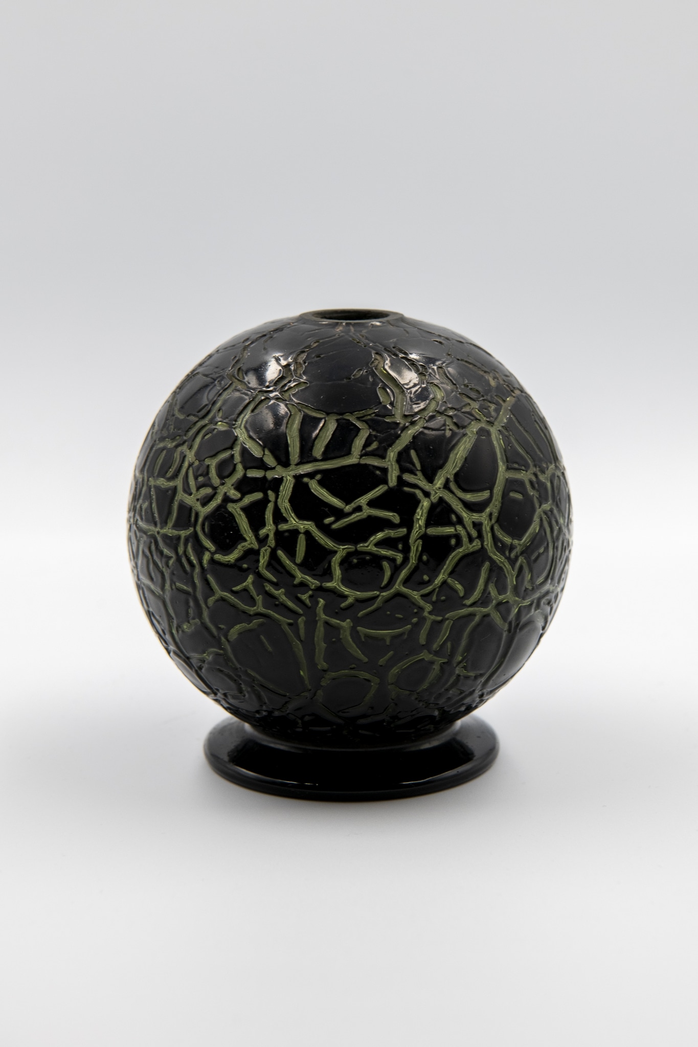 Verre vert soufflé en moule, pied appliqué, meulé à la hauteur du col, revêtement émaillé noir craquelé; forme: sphérique