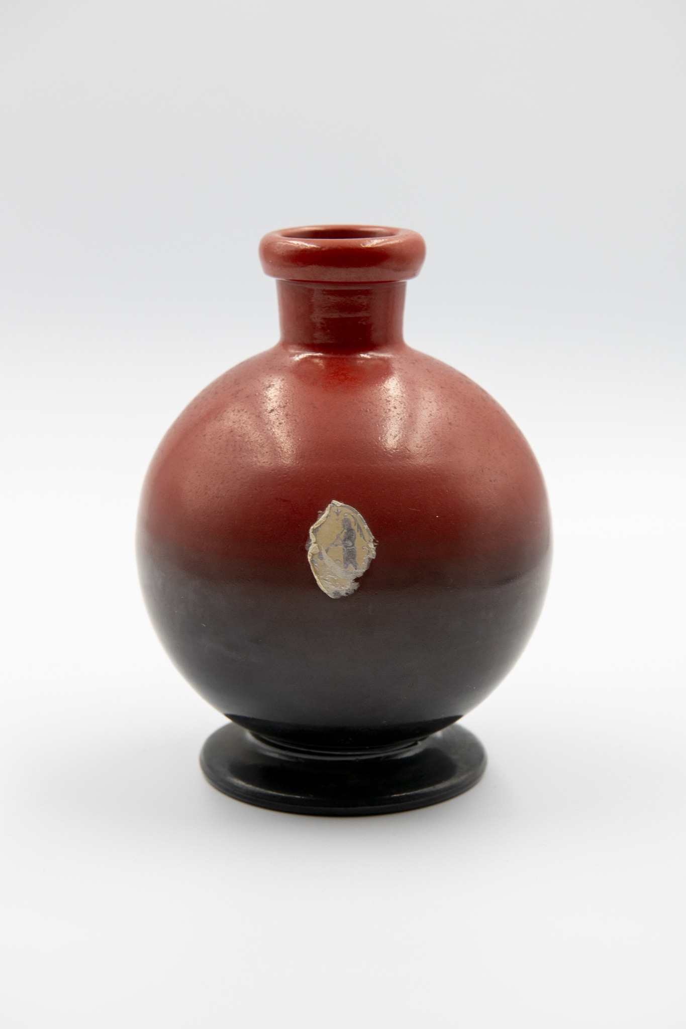 À en juger son diamètre, le vase présenté ici a été réalisé avant 1935. Il est en effet muni du timbre des premières années, placé sous le fond, et en plus de l'étiquette ornée du souffleur en usage dès 1935 (Dreyfus, 1981, 16). Son revêtement émaillé noir et rouge fait également déjà partie du catalogue en usage de 1931 à 1935.
