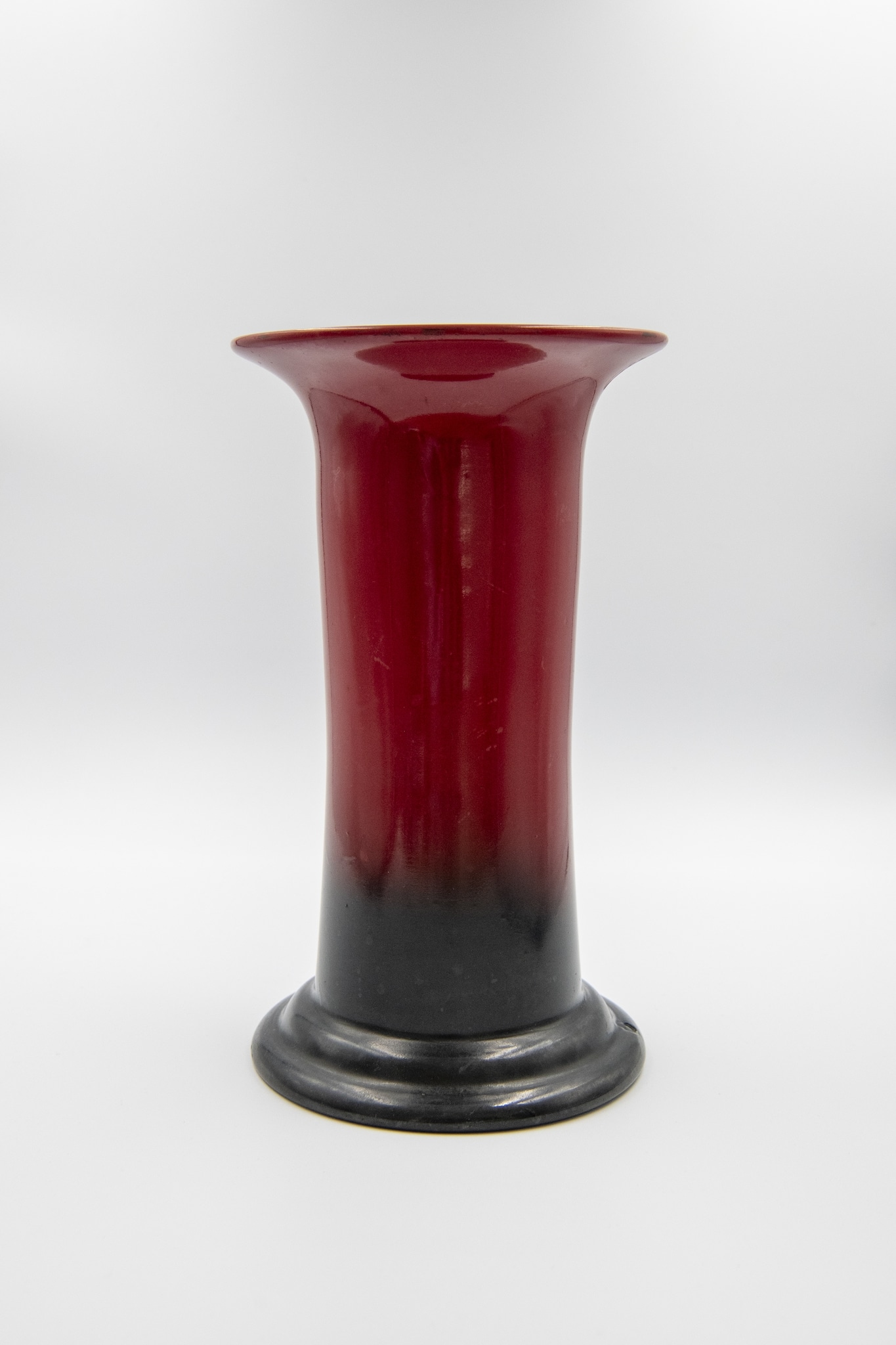 Sans le timbre doré des premières années ou autres particularités, rien ne suggère que le vase présenté ici ait été produit avant 1935. En revanche, le revêtement émaillé noir et rouge faisait déjà partie du catalogue en usage de 1931 à 1935. Pour garantir une production la plus efficace possible, les pièces sont d’abord émaillées en noir. Dans un second temps, la seconde couleur, le rouge ou le bleu, était appliquée de manière spontanée. Ainsi, bien que produite de manière semi-industrielle, chaque pièce est unique.