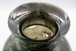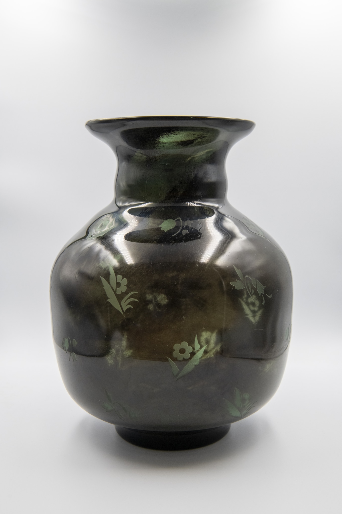 Ce vase doublé de verre noir et gravé à l'acide est orné de motifs de fleurs. Les photos qui montrent la lèvre ainsi que la basent permettent d'affirmer qu'il s'agit de verre doublé et non d'émail posé à l'aérographe. Dans ce cas, ni la base, ni la lèvre seraient recouvertes de couleur.