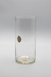 Verre vert, soufflé en moule, bord poli, revêtement émaillé bleu, recouvert d'une couche dorée. Les craquelures apparaissent lors de la cuisson qui fixe le décor; forme: cylindrique