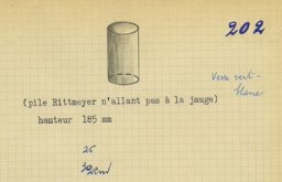 Ce modèle (202) de vase de la Verrerie artistique (1930-1964) a été mis en vente vers 1960. Les sources dont nous disposons sont des catalogues de la Verrerie de St-Prex, certains inédits. Il fait partie de l’offre de la liste de prix de 1960 (Verreries de St-Prex,1960), disponible en verre vert, émaillé noir, rouge et bleu ainsi qu’en or craquelé et platine. Il figure enfin dans un répertoire non publié, qui, basé sur les numéros d’inventaire des catalogues de 1935 à 1960, dresse la liste de tous les modèles de la production artistique. Notons que les images des modèles de 1960 ne sont pas tirées des catalogues, mais esquissées d’un coup de crayon rapide. Le no 200 est annoté ainsi : "Pile Rittmeyer n’allant pas à la jauge". Il pourrait s’agir d’un verre technique de la société Rittmeyer, fondée en 1904 et spécialisée dans les systèmes de mesure, ce qui expliquerait le grand nombre de pièces en verre incolore (Verreries de St-Prex, 1964, H 18.5, 25, 32 cm). Un inventaire de fin d’année pour les années 1955 à 1958, conservé dans les archives du Musée du Verrier de Saint-Prex, recense en effet une production de 671 exemplaires pour 1958 (Verreries de St-Prex, 1955, 257-259). Ainsi, il est probable que la Verrerie de St-Prex ait profité de synergies internes pour la création d’un nouveau modèle. D’après les sources, ce dernier fut commercialisé de 1958 à 1964.