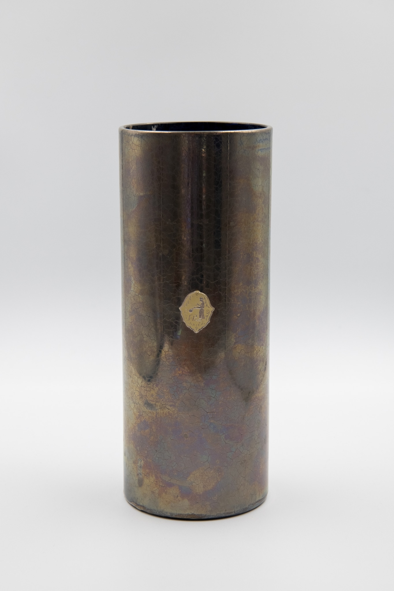 Verre vert, soufflé en moule, bord poli, revêtement émail bleu recouvert d'une couche platine. Les craquelures apparaissent après la cuisson qui fixe le décor; forme: cylindrique