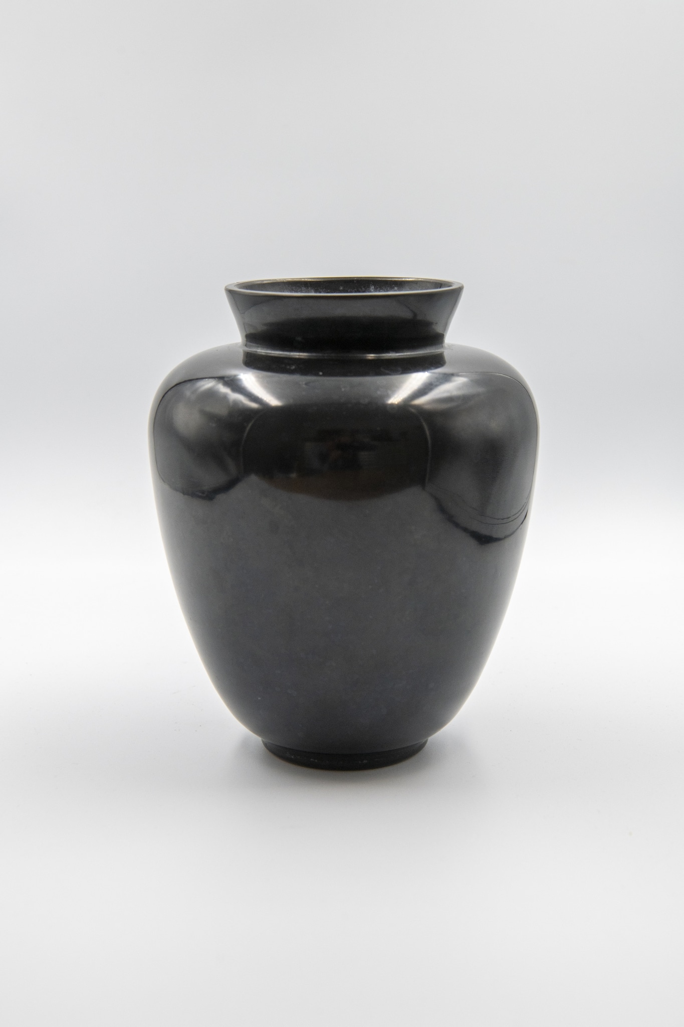 Par sa coloration brune, le verre du vase présenté ici est intéressant. Elle est en usage à la Verrerie artistique à deux reprises: de 1931 à 1935, souvent accompagnée du timbre doré appliqué sur le fond du vase. Elle est à nouveau documentée à partir de la publication des trois modèles du catalogue de 1949, dont celui-ci (Walther, 2025, 64-65). Notre vase est en plus muni d'un revêtement émaillé noir, qui faisait déjà partie du catalogue en usage de 1931 à 1935. Il évoque les fameuses terres lustrées noires du céramiste Paul Ami Bonifas.
