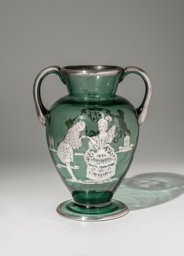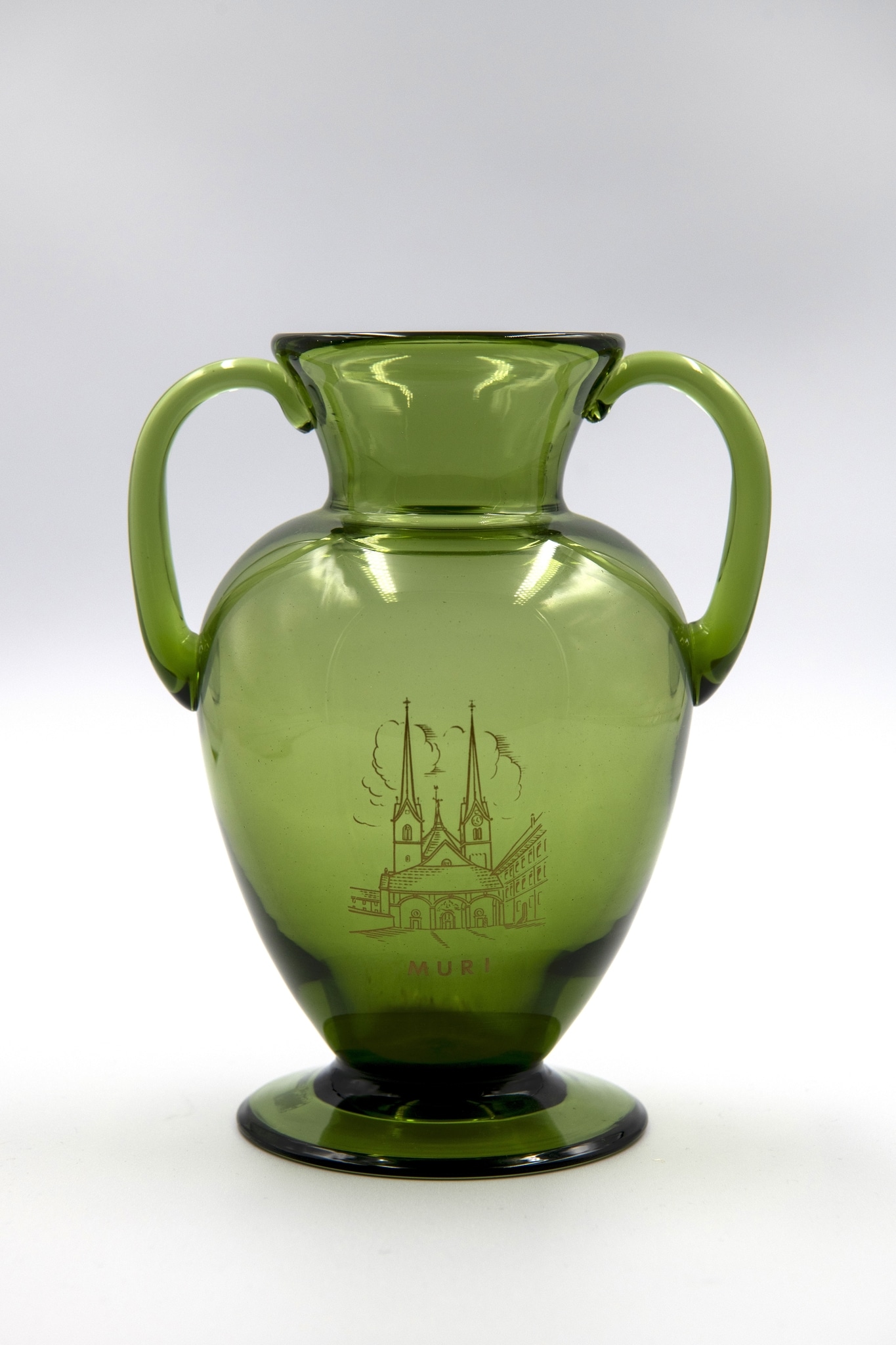 Le vase proposé ici a été réalisé entre 1949, date du modèle, et 1964. Lorsque les pièces en verre vert ne présentaient ni impuretés ni défauts de fabrication, elles étaient commercialisées telles quelles. Sinon, elles servaient de base à la réalisation de modèles émaillés. Notre vase est muni de l'image de l'église de Muri, commande peut-être réalisée à l'occasion de l'ouverture de l'hospice des bénédictins en 1957.