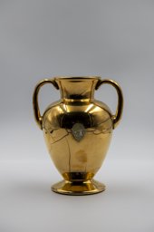 Ce modèle (197) de vase de la Verrerie artistique (1930-1964) a été commercialisé dès 1949. Les sources dont nous disposons sont des catalogues de la Verrerie de St-Prex, certains inédits. Il fait partie du "supplément" publié en 1949 (Verreries de St-Prex, 1949, 7), une offre disponible en verre vert, émaillé noir, rouge, bleu et or craquelé. Il figure enfin dans un répertoire non publié, qui, basé sur les numéros d’inventaire des catalogues de 1935 à 1960, dresse la liste de tous les modèles de la production artistique (Verreries de St-Prex, 1964, H 16 cm). D’après les sources, ce modèle est ainsi mis en vente en 1949 et produit jusqu’en 1964. Dans la critique récente, il est reproduit chez Dreyfus (Dreyfus, 1981, 13).