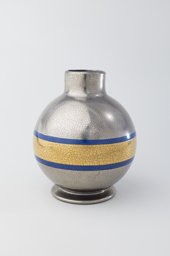 Ce modèle de vase (102) fut créé à une période précoce de la Verrerie artistique (1930–1964). Les sources dont nous disposons sont des catalogues de la Verrerie de St-Prex, tels que les albums noirs munis de photos de vases, vraisemblablement utilisés par les représentants de 1931 à 1935 (Verreries de St-Prex, 1931, no 164, H 27 cm). À petit pied et sans anses, couronné d’un col droit à lèvre retournée, on peut l’identifier facilement grâce sa taille haute. Il est proposé en argent, noir et vert. Dans le premier catalogue imprimé (Verreries de St-Prex, 1935), il correspond au 102. Dans un répertoire non publié de toute la production artistique de Saint-Prex, qui reprend la numérotation du catalogue de 1935 (Verreries de St-Prex, 1964), la forme boule apparaît en quatre tailles : en plus des modèles plus petits no 100 et 101 (sans et avec anses), les vases de 22 cm de diamètre reçoivent le no 102 et 103. Contrairement aux mesures indiquées dans le catalogue de 1931, ce n’est plus la hauteur, mais le diamètre qui fait foi. Ces modèles ne sont plus fournis dans la liste de prix de 1960 (Verreries de St-Prex, 1960). On peut relever que la lampe boule (modèle 176) est identique au modèles 100 et 102, mais sans col. D’après la chronologie qu’il est possible d’établir à l’aide des trois catalogues, ce modèle – présent dans le corpus en verre vert, rouge-noir et doré-argenté craquelé – fut élaboré dès 1931 et n’est plus proposé en 1960.