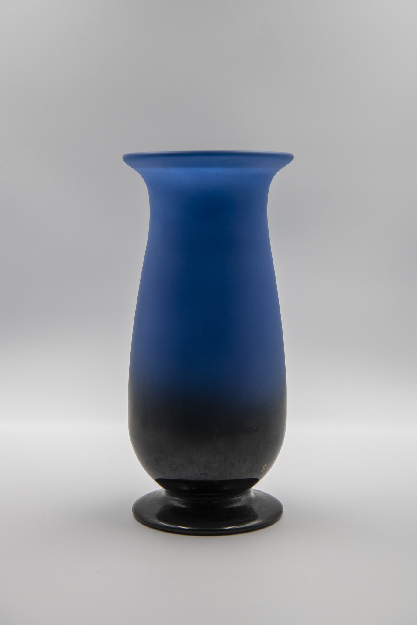 Verre incolore soufflé en moule, pied appliqué, revêtement émaillé noir et bleu posé à l'aérographe; forme: balustre