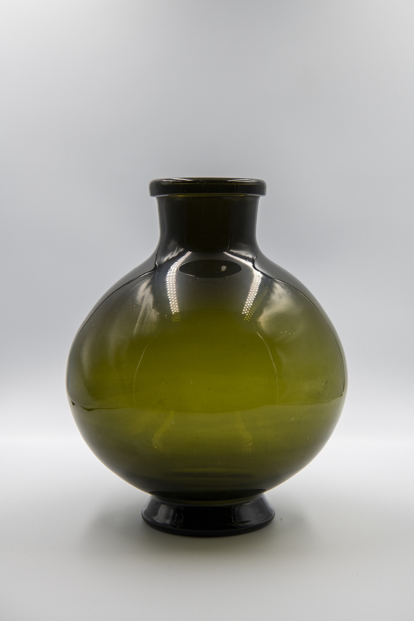 Verre vert soufflé en moule, lèvre retournée, talon appliqué; forme: panse boule, col étroit cylindrique