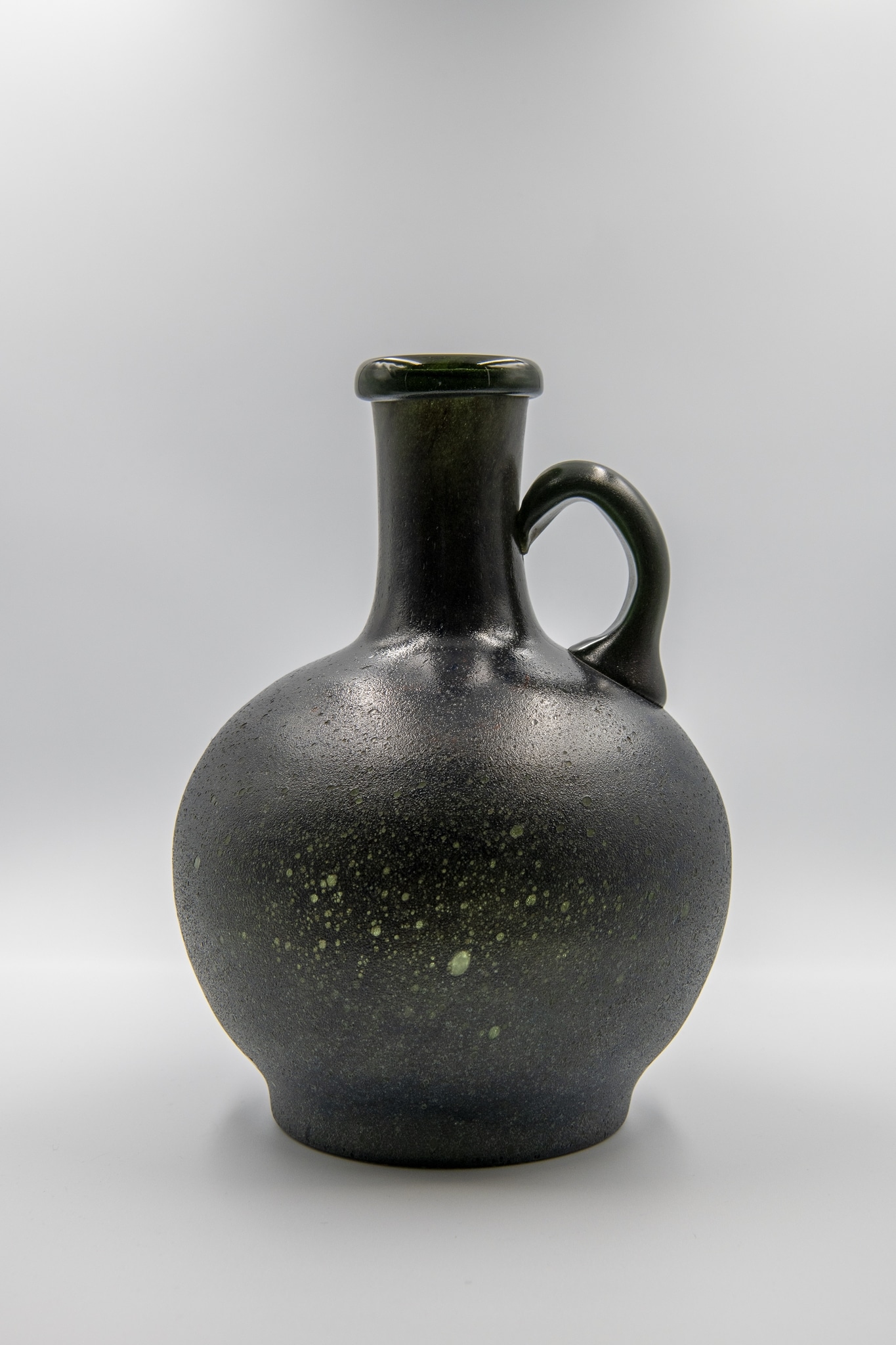 Verre vert soufflé en moule, coloration (noire et quelques pigments rouges) à chaud sans fusion, talon, long col à lèvre retournée et anse en verre noir (aérographe?) appliquée, marque de pontil couverte par couleur noire (aérographe), forme: panse boule