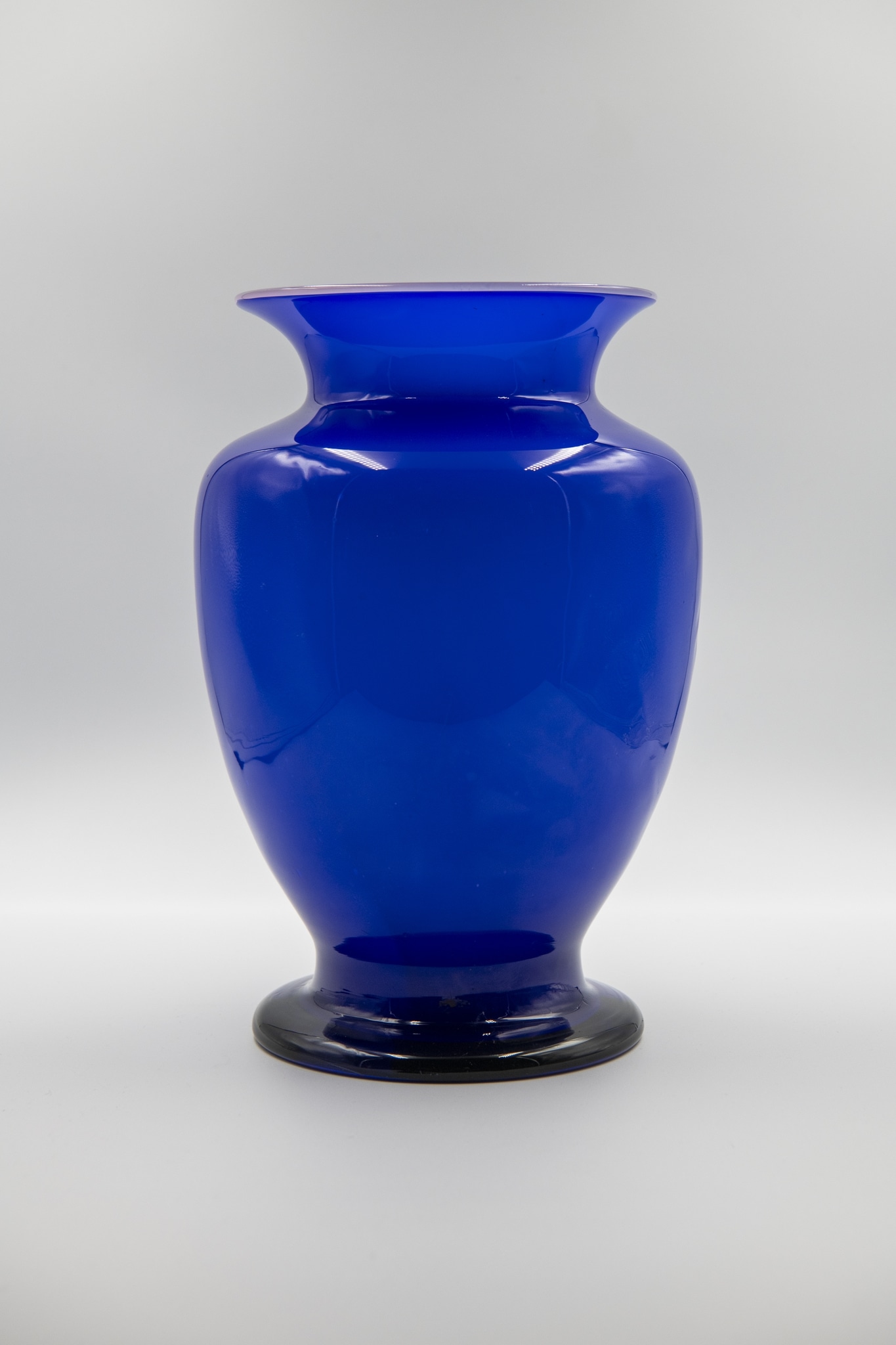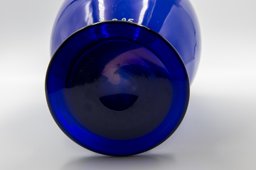 Le vase proposé ici étonne. Avec ses trois couches de verre – rose, incolore et bleu – il sort du cadre semi-industriel fixé depuis 1935. Faute de sources, l'artiste responsable ne peut être identifié.