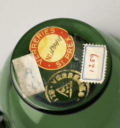 Ce modèle de vase (129) fut créé à une période précoce de la Verrerie artistique (1930-1964). Les sources dont nous disposons sont des catalogues de la Verrerie de St-Prex, certains inédits, tels que les albums noirs munis de photographies de vases, vraisemblablement utilisés par les représentants de 1931 à 1935, où ce modèle porte le no 184. Avec anse, il est disponible, en verre vert ou émaillé noir (Verreries de St-Prex, 1931, H 10 cm). Ce modèle à anse fait également partie de l’offre du premier catalogue de vente imprimé de 1935 (Verreries de St-Prex, 1935, 7), où il est présenté en verre vert. Il figure ensuite dans un répertoire non publié, qui, basé sur les numéros d’inventaire des catalogues de 1935 à 1960, dresse la liste de tous les modèles de la production artistique (Verreries de St-Prex, 1964, H 9 cm). D’après les sources, ce modèle a été ainsi élaboré dès 1931 et produit jusqu’en 1964.