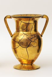 Verre transparent turquoise, soufflé en moule, anses (avec petit retour à la pince) et pied appliqués, revêtement émaillé bleu, recouvert de dorure. Les craquelures irrégulières apparaissent lors de la recuisson qui fixe le décor; forme: panse ovoïde