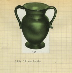 Ce modèle de vase (145) fut créé à une période précoce de la Verrerie artistique (1930-1964). Les sources dont nous disposons sont des catalogues de la Verrerie de St-Prex, certains inédits, tels que les albums noirs munis de photographies de vases, vraisemblablement utilisés par les représentants de 1931 à 1935, où ce modèle porte le no 165 (H 23-43 cm). Il est disponible en verre vert, émaillé noir, rouge, et argenté craquelé (Verreries de St-Prex, 1931). Il fait également partie de l’offre du premier catalogue de vente imprimé en 1935 (Verreries de St-Prex, 1935, 2, 15), où ce vase est décliné en verre vert et en or craquelé.