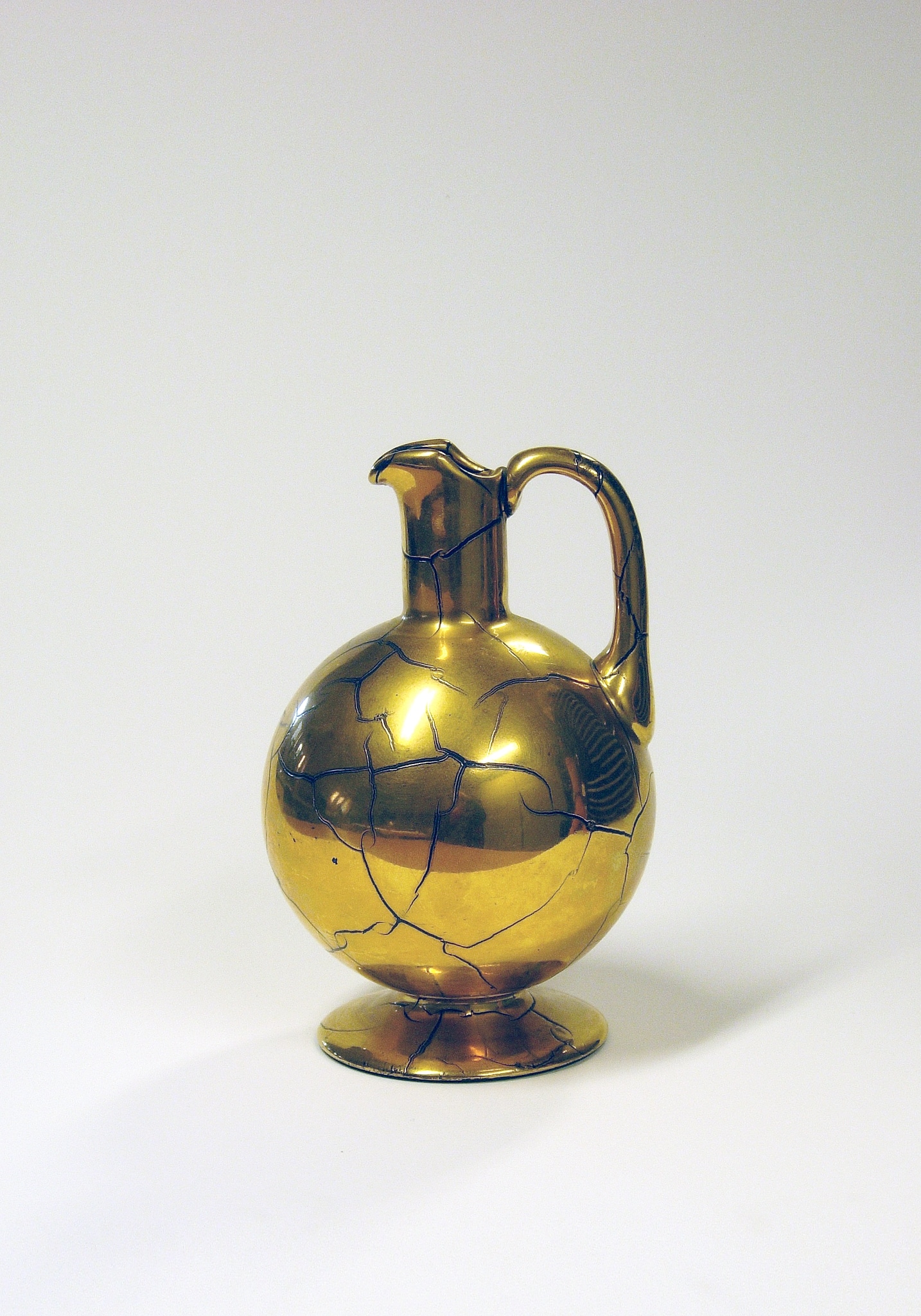 Verre turquoise, soufflé en moule, col droit, bec verseur, pied et anse appliqués; revêtement émaillé bleu puis doré, les craquelures irrégulières apparaissant lors de la cuisson qui fixe le décor; forme: panse sphérique