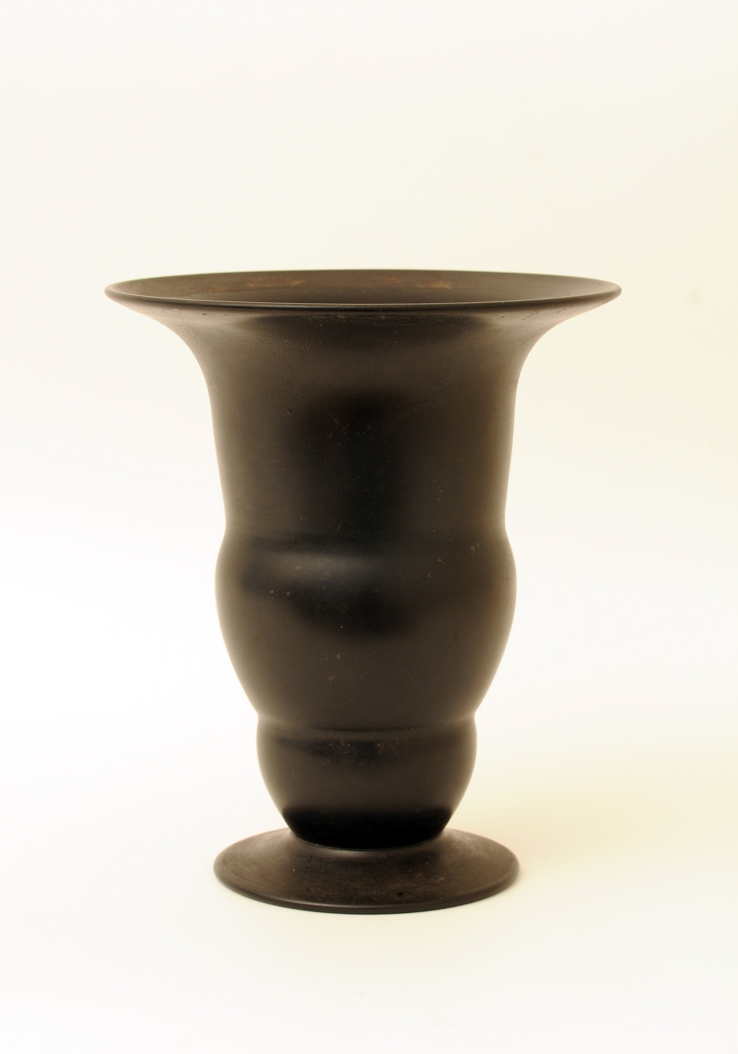 Ce modèle (178) de vase de la Verrerie artistique (1930-1964) a été commercialisé dès 1937. Les sources dont nous disposons sont des catalogues de la Verrerie de St-Prex, certains inédits. Il fait partie de l’offre des Nouveautés, publiée en 1937 (Verreries de St-Prex, 1937, H 22 cm), qui est disponible en verre vert (VV), émaillé en noir, rouge-brillant et rouge-mat (N, RB et RM), en bleu-brillant et bleu-mat (BB et BM), en argenté lustré et craquelé (AL et AC), et finalement en or bordé, lustré et craquelé (OB, OL et OC). Il figure finalement dans un répertoire non publié, qui, basé sur les numéros d’inventaire des catalogues de 1935 à 1960, dresse la liste de tous les modèles de la production artistique (Verreries de St-Prex, 1964, H 22 cm). Il orne par ailleurs le porte-calendrier publicitaire de l’année 1949, réalisé par l’artiste Karl Otto Ernst (1884-1967). D’après les sources, ce modèle est ainsi mis en vente dès 1937 et produit jusqu’en 1964.