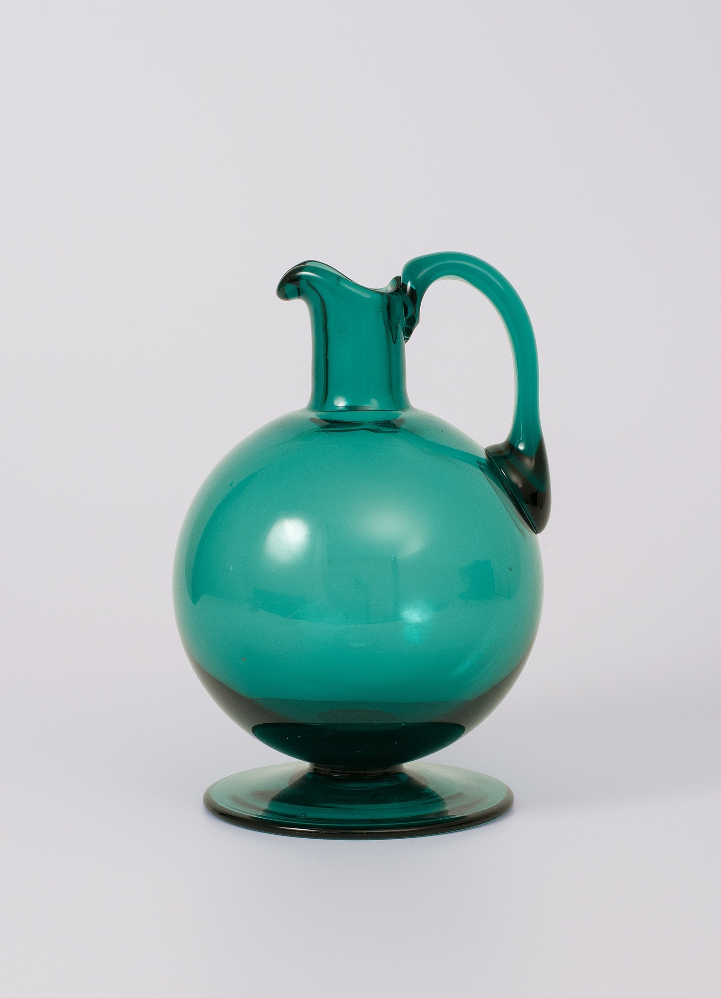 Verre turquoise, soufflé en moule, col droit, bec verseur, pied et anse appliqués; forme: panse sphérique