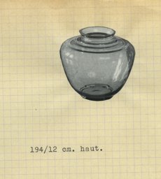 Ce modèle (194) de vase de la Verrerie artistique (1930-1964) a été commercialisé dès 1949. Les sources dont nous disposons sont des catalogues de la Verrerie de St-Prex, certains inédits. Il fait partie du „supplément“ publié en 1949 (Verreries de St-Prex, 1949, 7), une offre disponible en verre vert, émaillé noir, rouge, bleu et or craquelé. Il figure enfin dans un répertoire non publié, qui, basé sur les numéros d’inventaire des catalogues de 1935 à 1960, dresse la liste de tous les modèles de la production artistique (Verreries de St-Prex, 1964, H 18 cm). D’après les sources, ce modèle est ainsi mis en vente en 1949 et produit jusqu’en 1964. Dans la critique récente, il est reproduit chez Dreyfus (Dreyfus, 1981, 13).