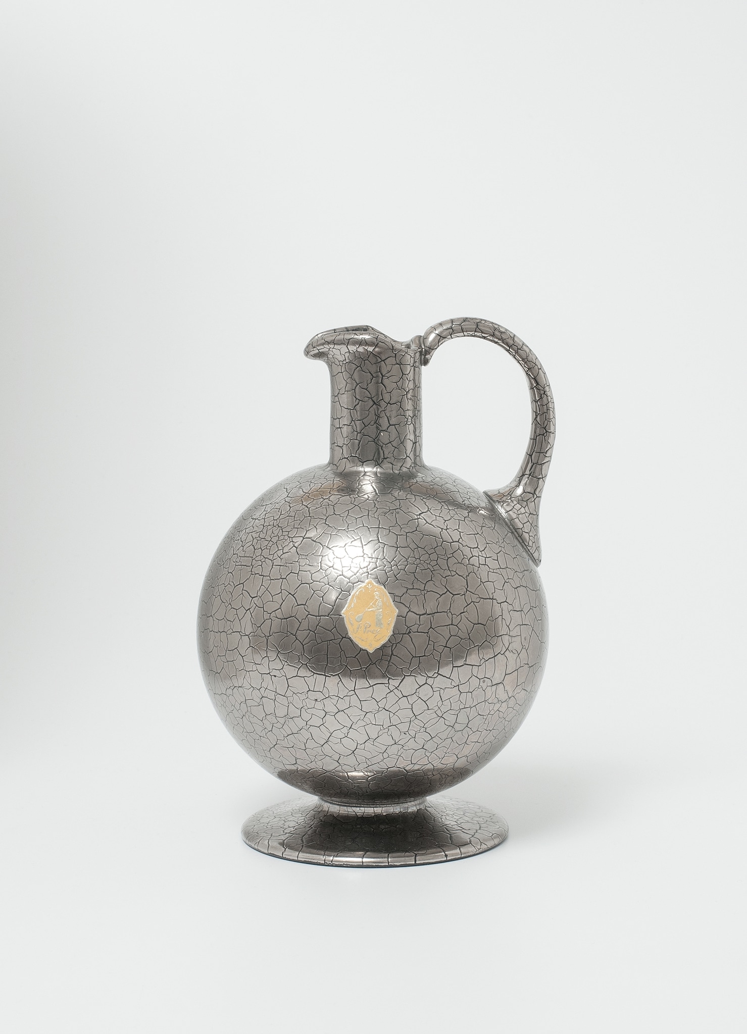 Verre vert soufflé en moule, col droit, bec verseur, pied et anse appliqués; revêtement émaillé bleu, puis argenté. Les craquelures irrégulières apparaissent lors de la cuisson qui fixe le décor; forme: panse sphérique