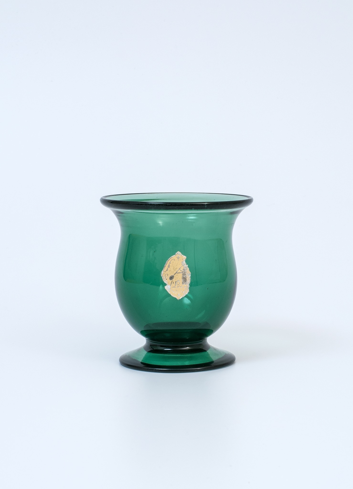 Verre vert soufflé en moule, travaillé à la pince, lèvre évasée, pied appliqué à chaud; forme: panse balustre