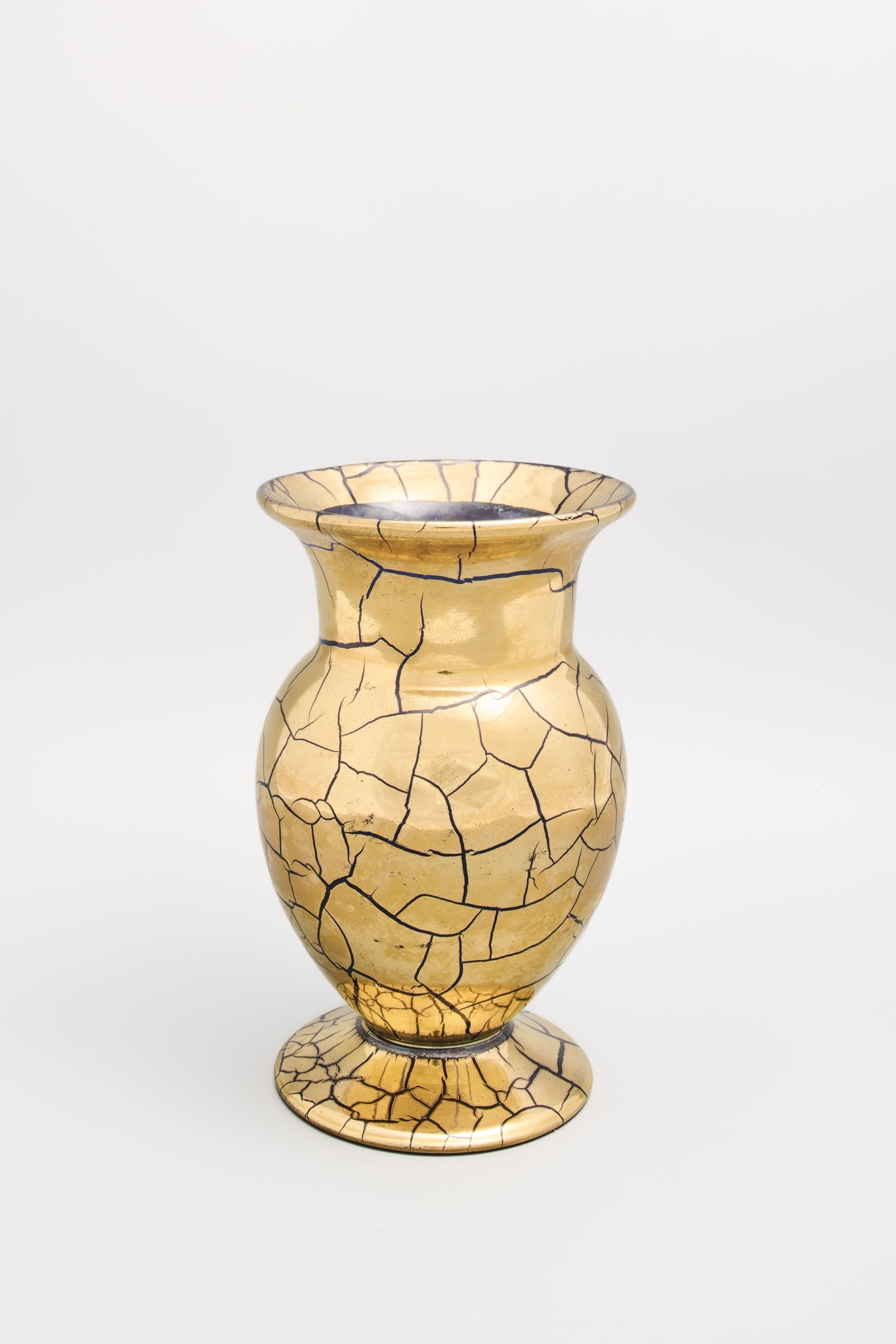 Le décor doré craquelé du vase présenté ici est emblématique de la Verrerie artistique, son apparition coïncidant avec la publication du catalogue de 1935. La qualité du craquelé évoque une phase transitoire entre le serré et peu brillant des débuts et le craquelé large et brillant de l’après-guerre, période marquée par la disparition de l’émail bleu initial (Walther, 2025, 65).