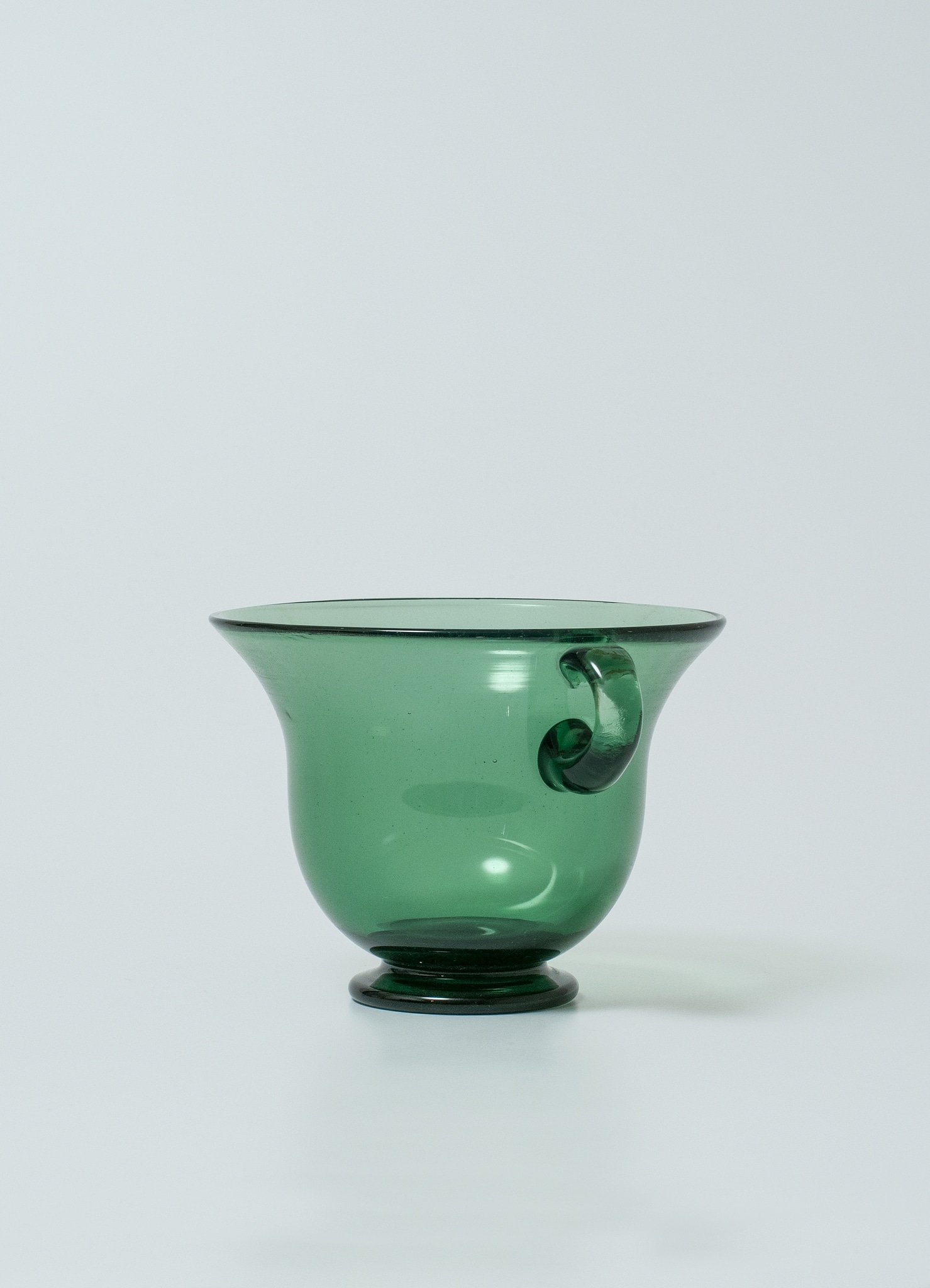 Ce modèle de vase (129) fut créé à une période précoce de la Verrerie artistique (1930-1964). Les sources dont nous disposons sont des catalogues de la Verrerie de St-Prex, certains inédits, tels que les albums noirs munis de photographies de vases, vraisemblablement utilisés par les représentants de 1931 à 1935, où ce modèle porte le no 184. Il est disponible avec anse, en verre vert ou émaillé noir (Verreries de St-Prex, 1931, H 10 cm). Ce modèle fait également partie de l’offre du premier catalogue de vente imprimé de 1935 (Verreries de St-Prex, 1935, 7), où il est présenté en verre vert. Il figure ensuite dans un répertoire non publié, qui, basé sur les numéros d’inventaire des catalogues de 1935 à 1960, dresse la liste de tous les modèles de la production artistique (Verreries de St-Prex, 1964, H 9 cm). D’après les sources, ce modèle a été ainsi élaboré dès 1931 et produit jusqu’en 1964.