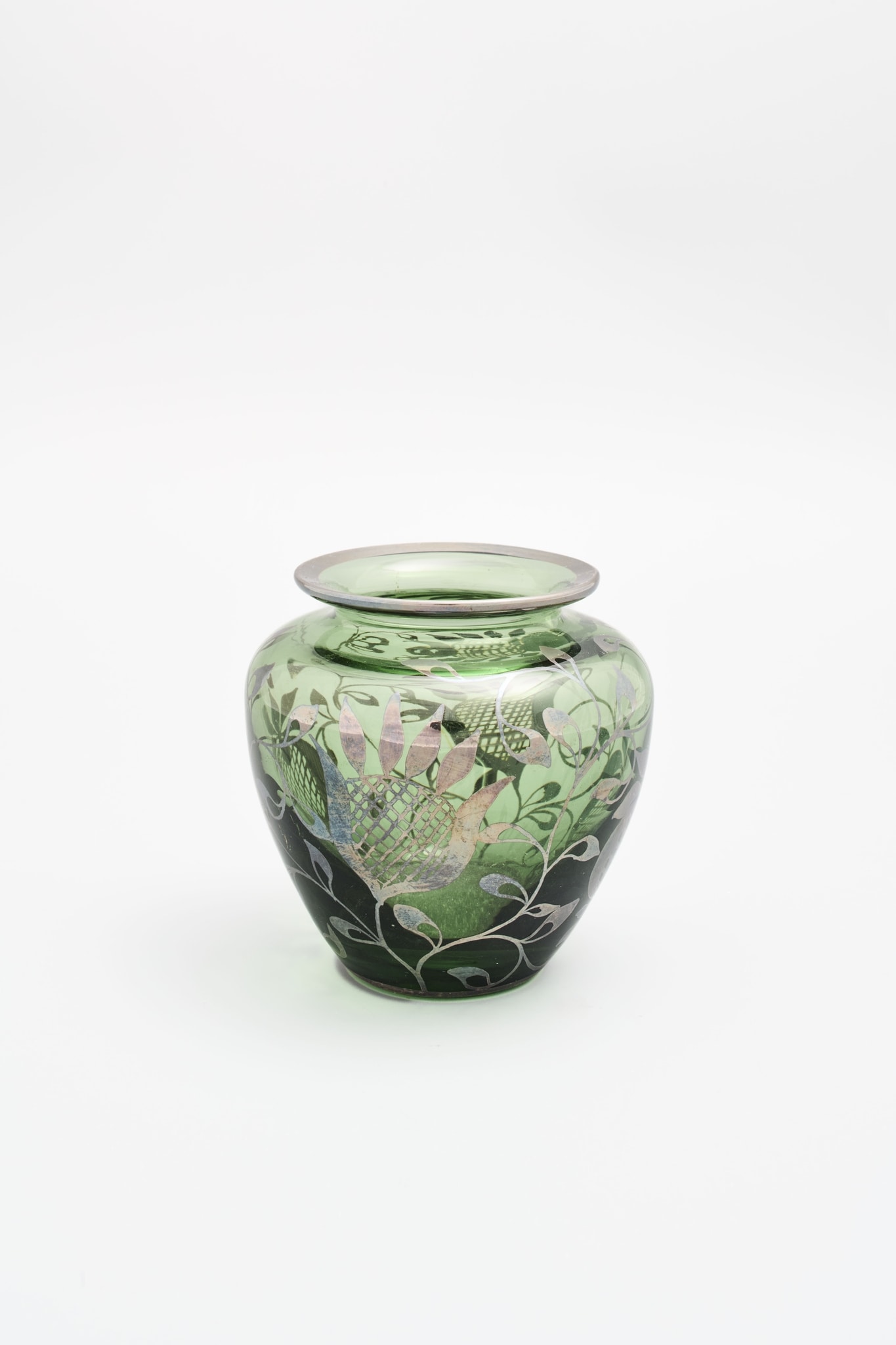 Verre vert, soufflé en moule, décor argenté appliqué par galvanoplastie; forme: panse tronconique, lèvre évasée