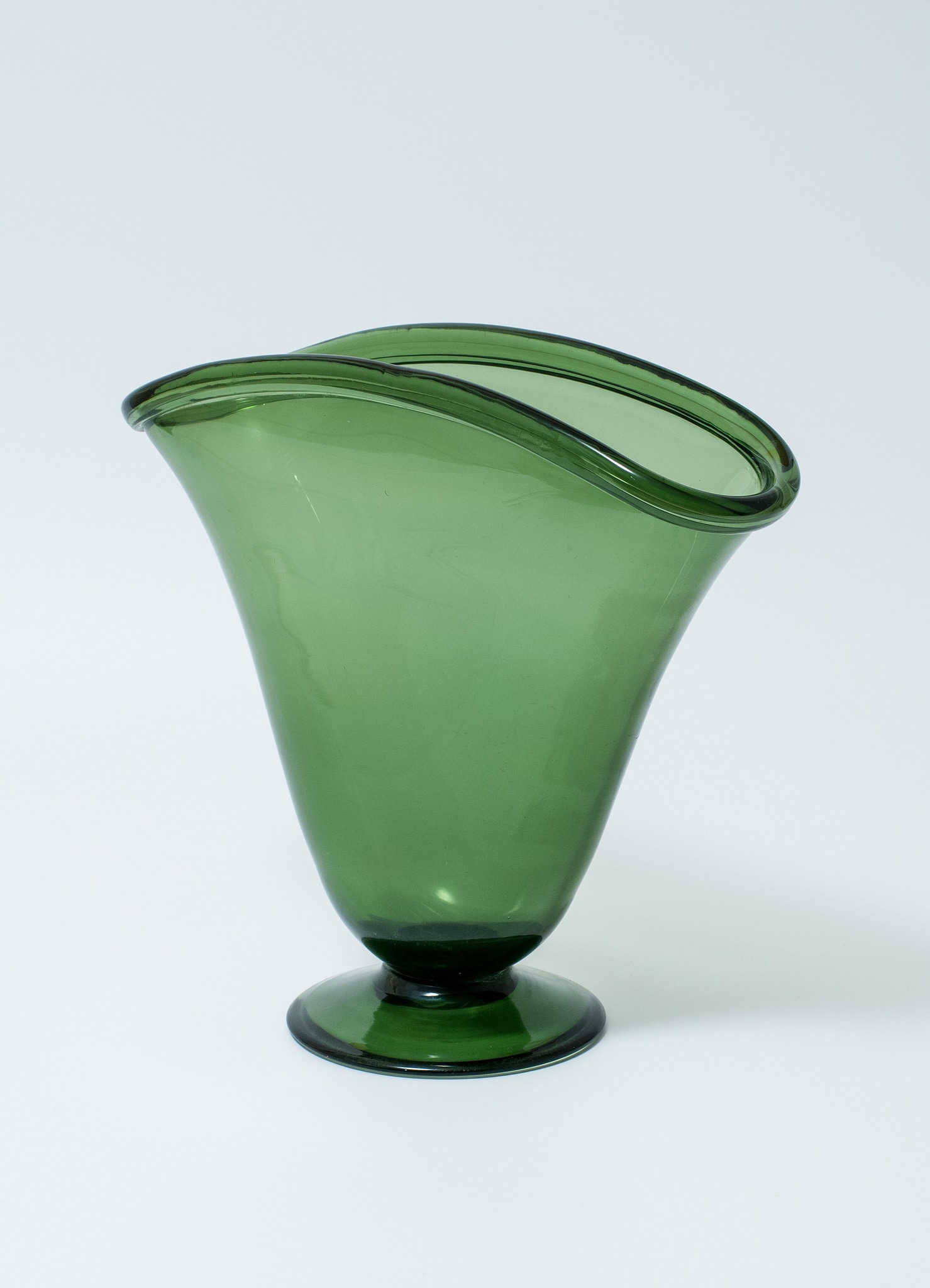 Vase en verre vert soufflé en moule, pied appliqué, lèvre retournée; forme: panse méplate, en forme d'éventail