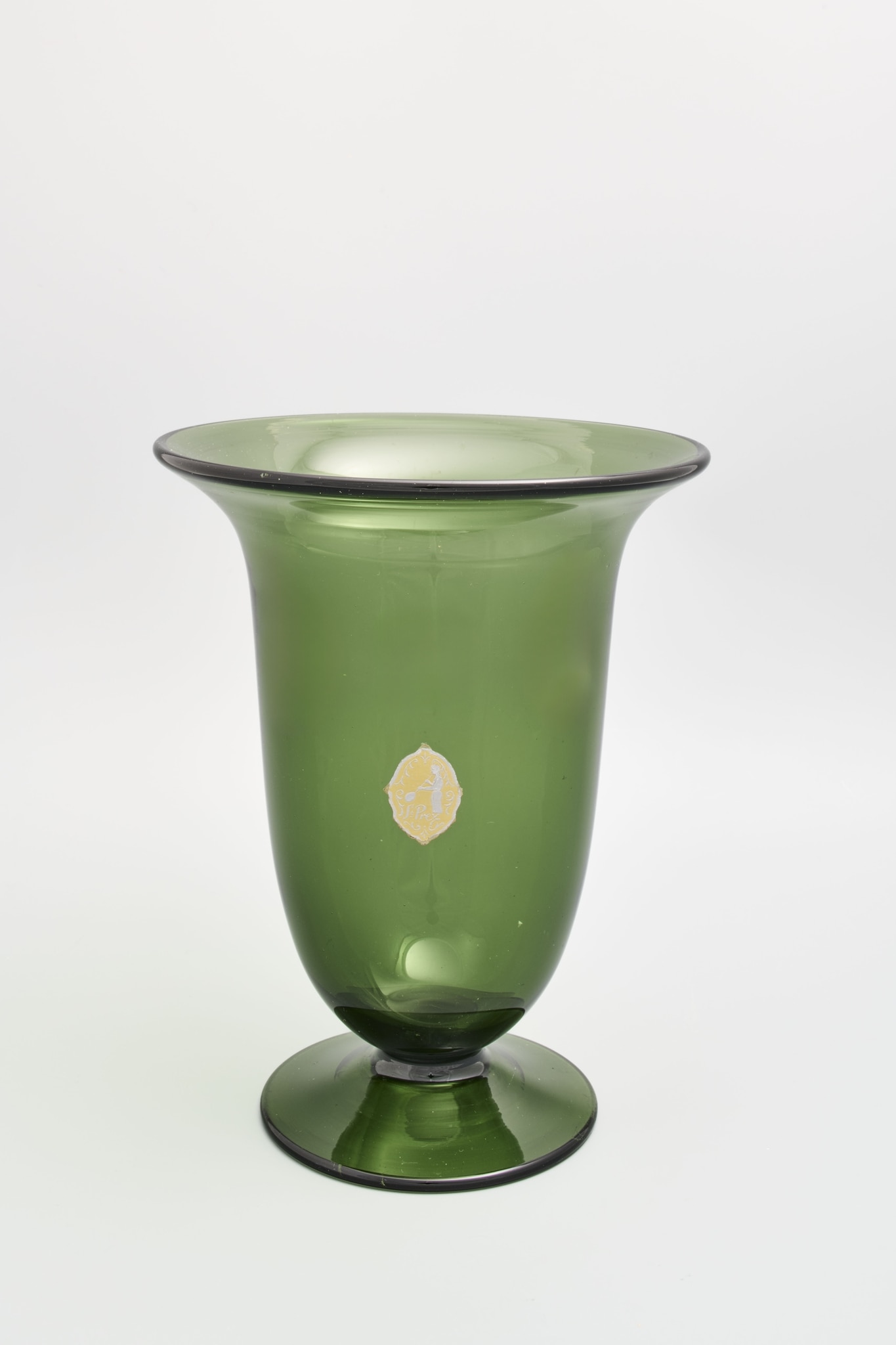 Le vase en verre vert présenté ici, muni de l'étiquette dorée, est typique de la production dès 1935.