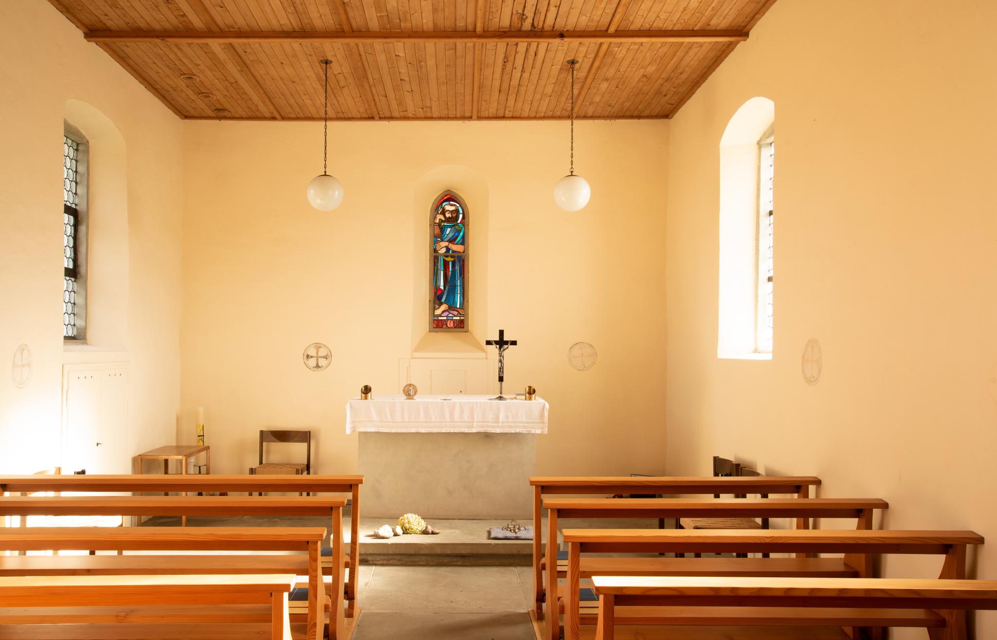 Kernbau von 1454–55, barockisiert 1758. Arkadenvorhalle, Dachreiter mit Zwiebelhaube, renov. 1950. In der östlichen Stirnwand Lanzettfenster der Bauzeit mit Glasmalerei von Rosmarie Hertel 1950.