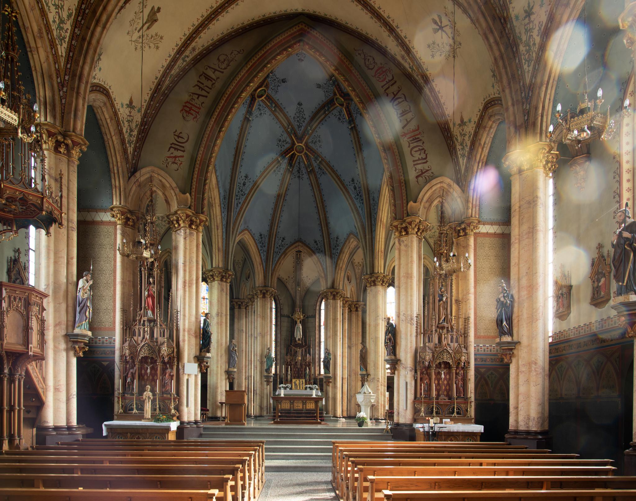 Erster Kirchen-Betonbau der Schweiz, von August Hardegger 1889–90 im neugotischen Stil nach der Kirche in Lourdes erbaut. Restauriert 1971–74.