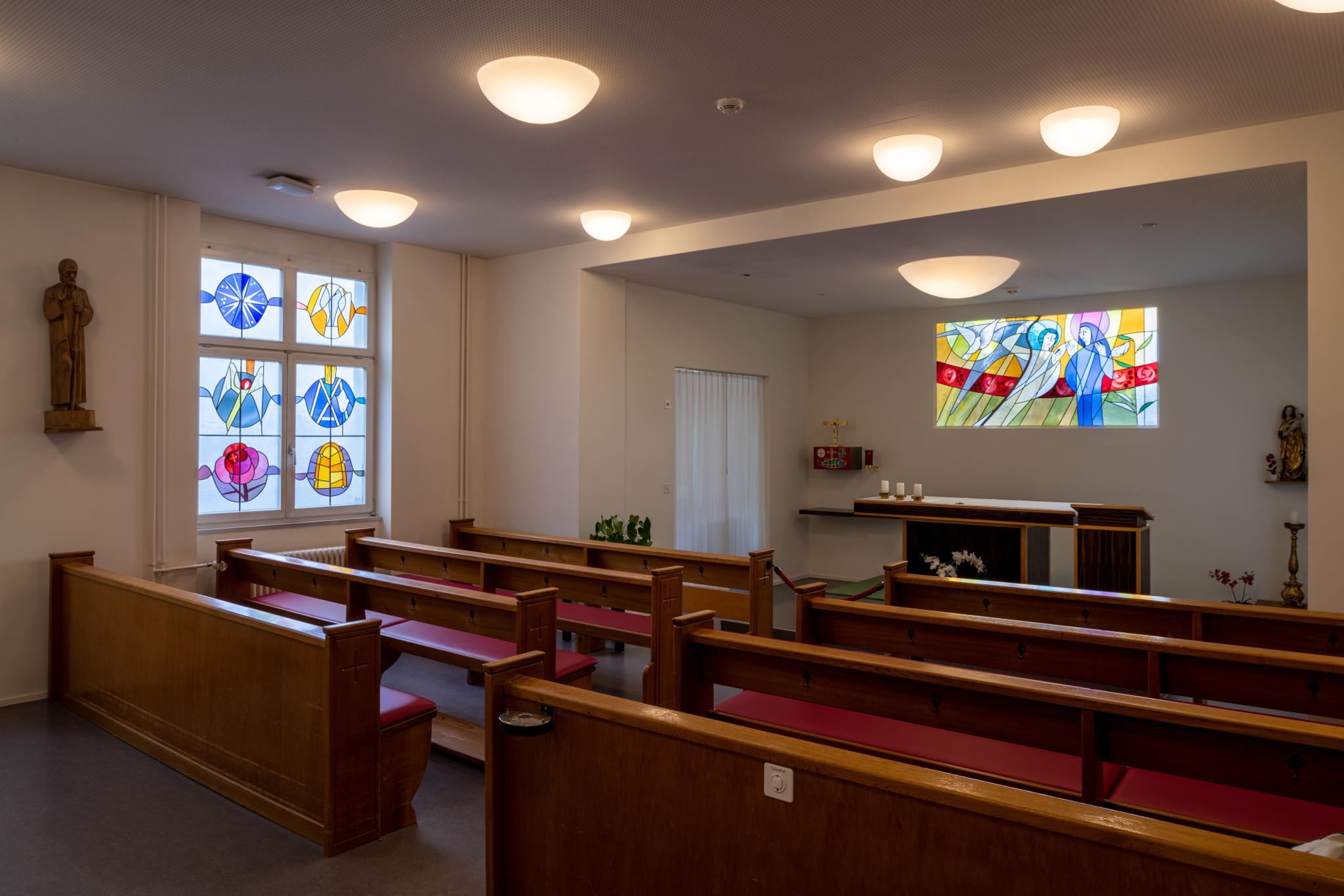 Der ursprünglich als Versammlungssaal des Arbeiterinnenheims im 1. Obergeschoss des südöstlichen Anbaus genutzte Raum fungiert mindestens seit 1977 als Rosenkranzkapelle. 1987 und 1996 integrierte das in Engelburg ansässige Glasmaleratelier von Heinrich Stäubli drei farbige Glasmalereifenster in der Kapelle (HS_1081; HS_1082; HS_1083).